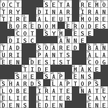 ACROSS 1. Sep. follower 4. Stalk of a moss capsule 8. San ____ (Riviera town) 12. Attempt to accomplish something 13. Middle Eastern gold or silver currency 14. SW Asia republic 15. Become fatigued 17. Eskimo relative 18. Greater amount 19. Mood resulting from idleness 21. Eats (away) 23. Small bed 24. Symbol (abbr.) 26. Compass dir. 27. Flat circle 28. Queen of England 1702-14 30. Small amount or degree 31. Flew 34. Bar 37. RI univ. 38. Leg coverings 39. According to 40. Car or cant ending 41. Stop 42. Gear tooth 43. Event that recurs at intervals 44. Cause to be 46. A female animal or person 47. Plant excrement 50. Followers of ems 51. Pottery fragments 54. Portable computers 57. Ear part 58. Feeling or showing extreme anger 60. Nathan's nickname 62. Writer Wiesel 63. 61 cubic inches 64. Island 65. Lairs 66. Genesis locale 67. Compass dir. DOWN 1. Baseball player Mel 2. Baby bed with high sides 3. Polypeptide antibiotic 4. Grain storage towers 5. Foe 6. The 19th letter of the Greek alphabet 7. Johnson of "Laugh-In" 8. Full of chinks, cracks, or crevices 9. Eat (away) 10. Female horse 11. Washington bills 13. Male parent 16. Greek god of love 20. And so on (abbr.) 22. Tear apart 25. Shops 27. Have the gumption 29. Egg locale 30. Third day of the wk. 31. Moved rapidly 32. Fertile tracts in a desert 33. Black tropical American cuckoo 34. Keyboard key 35. _ vera 36. Tired old horse 41. Passed on 43. Triads 44. Was introduced to 45. At once, immediately (arch.) 46. Unit of acoustic absorption 48. Having winglike extensions 49. Eucharist need 51. Downhill vehicle 52. Hollow 53. Filth; sediment 55. For each 56. Comedian Laurel of Laurel & Hardy 59. To free from 61. Sight organ