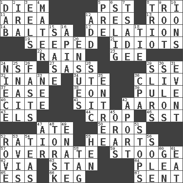 ACROSS 1. South Vietnam president (1954) 5. Pacific Standard Time (abbr.) 8. Three (prefix) 11. Type of rug 12. Ancient Greek god of war 13. Friend of Pooh 14. Greek mezzo-soprano Agnes 17. Accusation by an informer 19. Oozed 21. Foolish or stupid persons 22. Water falling in drops from the sky 23. Unit of force equal to gravity 24. Overdraft (abbr.) 27. Backtalk 29. Compass dir. 32. Silly 34. Shoshoni 36. 154 in Roman numerals 37. Comfort 38. A really long time 39. Whimper 40. Quote 41. Be seated 42. Composer Copland 43. Raised railways 44. Riding implement 46. Fast jet (abbr.) 47. Had dinner 50. Greek god of love 52. Food allowance for one day 55. Centers 57. Make much ado about nothing 59. Moe Howard, for one 62. By way of 63. Comedian Laurel of Laurel & Hardy 64. Entreaty 65. Curvy letter 66. Cask 67. Transmitted DOWN 1. Small moist lump or mass 2. Retirement account (abbr.) 3. Snakelike fish 4. Mother 5. Before (prefix) 6. Major League Baseball Commissioner Bud 7. Sadhe (variant) 8. Musical group of three 9. Carrot, for example 10. Charged atoms 12. Say or write further 15. Gospel singer Marvin 16. Capital of Western Samoa 18. Make a knot 20. Follows as a consequence or result 24. Sibling's daughter 25. Slow-paced one 26. Goes without food and/or water 28. Unemotional 29. Plays smoothly or legato 30. Grain storage towers 31. Incident 33. Born 35. Main course 36. Tax preparer (abbr.) 42. To the left, to Queeg 45. Mouths or openings 47. Atmosphere 48. Cod relative 49. Related on the mother's side 51. Halts 52. Be footloose 53. Deliberation 54. Afternoon social gatherings 55. Layer 56. Flatfish 58. Label 60. Commissioned mil. rank 61. Ingest