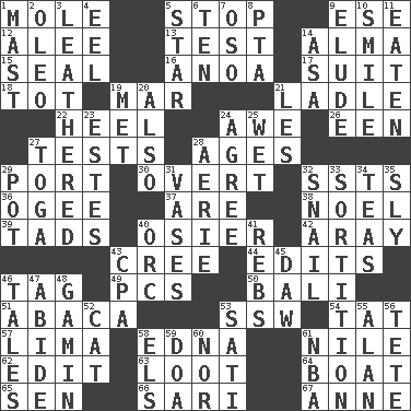 ACROSS 1. Undercover agent 5. Obstruct or block passage 9. Compass dir. 12. Toward shelter 13. Trial 14. _ mater 15. Lick closed 16. Small Philippine buffalo 17. Set of matching outer garments 18. Small child 19. Third mo. 21. Dipping utensil 22. Person who is morally reprehensible 24. Deep reverence 26. Car or cant ending 27. Trials 28. Matures 29. Left side of a ship or aircraft 30. Unconcealed 32. Fast planes 36. Double curve, resembling the letter S 37. "We ___ not amused" (Victoria) 38. Christmas carol 39. Small boys 40. Flexible twig of a willow tree 42. Like ___ of sunshine 43. Algonquian 44. Proofreads 46. Label 49. Personal Computers (abbr.) 50. Indonesian resort city 51. Phillipine bananalike plant 53. Compass dir. 54. Make lace 57. Pale green bean 58. Pulitzer Prize-winning author Ferber 61. "Death on the ____" 62. Prepare for publication 63. Plunder 64. Water vessel 65. Elected rep. 66. Indian skirt 67. Queen of England 1702-14 DOWN 1. Vertical spar for supporting sails 2. Butter sub 3. Tough but pliablecoriaceous 4. Snakelike fish 5. Play the lead 6. Nine, plus one 7. Bear (Spanish) 8. Parent Teacher Association (abbr.) 9. Dodge 10. Grin 11. Eroded 14. White ___ sheet 19. Was introduced to 20. In addition 21. French article 23. _____ Park, CO 24. Match 25. Soggy 27. Ancient Roman robe 28. Nest on high 29. Cooking vessel 31. Flower holders 32. Slow-paced one 33. Determination 34. Beverages made from leaves 35. Insidious 40. The grampus (Milton) 41. Confederate soldiers (slang) 43. Numbers guy (abbr.) 45. Fool 46. Lies 47. Remain 48. Homeless child 52. Feline 53. Suttee (variant) 55. ____ Jay Lerner 56. Wig 58. Raised railways 59. ___ good deed 60. Not either 61. Basketball assoc.