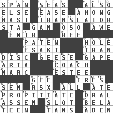 ACROSS 1. Connect, as a bridge 5. Oceans 9. In addition 13. Otherwise 14. Relaxation 15. Amid 16. Political cartoonist Thomas 17. Interpreter 19. R.R. building 20. Separate the seeds from cotton 21. Bear (Spanish) 22. Deep reverence 23. Independent ruler or chieftain 25. To separate or throw off 26. Eucharist need 30. Hollow 34. 1973 Nobel Price Winner (Physics) Leo 35. SW Asia republic 36. Flat circle 39. Honkers 42. Open wide 43. Operatic vocal solo 44. Team commander 46. Drug cop 47. First name in cosmetics 48. Turn to the right 51. Angers 54. Elected rep. 57. Acura sports coupe 58. 100% 60. Had dinner 62. Appease 65. Spoken 66. NE Netherlands city 67. Notch 68. Actor Lugosi 69. Adolescent 70. Scottish caps 71. Arabian gulf DOWN 1. Elected reps. 2. Food holder 3. Indian state 4. Fish or hair follower 5. Bristle 6. Merit 7. White ___ sheet 8. Sir (Sp.) 9. Wet nurse (var.) 10. Globular water bottle used in Asia 11. Overwhelm 12. Legendary monster 15. _ vera 18. Compass dir. 20. Pate de foie ____ 24. Medicinal drug used to evoke vomiting 27. Label 28. Supplement with great effort 29. Sibling's daughter 30. Having greater elevation 31. Mouth or opening 32. Pet locale 33. Compass dir. 36. One of the 12 tribes of Israel 37. Lyricist Gershwin 38. Title for a knight 40. Mayday 41. Ingest 45. To provide with a ceiling 48. Broad smile 49. Eastern Standard Time (abbr.) 50. Be 52. Having ears or earlike features 53. Lacking originality or spontaneity 54. Argument over a trivial matter 55. Celtic language 56. Olfactory organ 58. Tiny particle 59. Allows 61. Enthusiasm 63. Writing instrument 64. In the manner of 65. Chief or king in Benin or Nigeria
