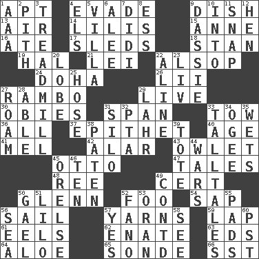 ACROSS 1. Fitting 4. Elude 9. Food container 13. Atmosphere 14. Ms. Damita and namesakes 15. Queen of England 1702-14 16. Had dinner 17. Bobsleighs 18. Comedian Laurel of Laurel & Hardy 19. Actor Linden 21. Flowery wreath 22. Columnist Joseph or Stewart 24. Capital of the state of Qatar 26. Cards in a Roman deck? 27. Role for Stallone 29. Not recorded 30. Off-Broadway awards 31. Connect, as a bridge 33. Pull behind 36. 100% 37. Curse 40. Ripen 41. Cartoonist voice _ Blanc 42. Having or resembling wings 43. A small or young owl 45. "Beetle Bailey" pooch 47. Falsehoods 48. To sift 49. An absolute certainty 50. American astronaut and politician John 52. Egg _ yung 54. Plant excrement 56. Travel by water 57. Tall tales 59. Infant locale 61. Snakelike fish 62. Related on the mother's side 63. Begley and Asner 64. Medicinal plant 65. Something which is sent 66. Fast jet (abbr.) DOWN 1. American Automobile Association (abbr.) 2. Heart or essence 3. Excercise machine 4. Raised railways 5. Country residence 6. Toward shelter 7. "You Light Up My Life" star Conn 8. Curvy letter 9. Small ungulate mammals of Africa 10. To the inside or interior of 11. Fastener 12. Layer 20. Ear part 22. Place in a line 23. 54 in ancient Rome 25. Stockings 27. Wander 28. Competent 29. Cowardly lion portrayer 31. Grain storage tower 32. Parent Teacher Association (abbr.) 33. Baron Munchausen's specialties 34. Double curve, resembling the letter S 35. Soaks 38. Eucharist need 39. Carry 44. Armed conflicts 45. Threatening words 46. "___ Little Indians" 49. Continued (abbr.) 50. Highlander 51. _ and Stitch 52. Papal veil 53. NW Algerian seaport 55. Writing tablets 56. Ocean 57. It is so 58. Perceive with the eye 60. Pacific Standard Time (abbr.)