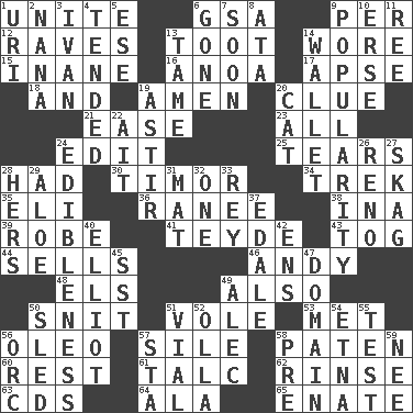 ACROSS 1. Join together 6. Girls' org. (abbr.) 9. For each 12. All-night dance parties 13. A blast of a horn 14. Had on 15. Lacking in sense or substance 16. Small Philippine buffalo 17. Domed church section 18. Added to 19. So be it 20. A slight indication 21. Comfort 23. Everything 24. Prepare for publication 25. Lacerates 28. Possessed 30. The easternmost of the Lesser Sundas 34. Long journey 35. Biblical high priest 36. The wife of a rajah (variant) 38. _ tizzy (2 wds.) 39. Loose flowing garment 41. Miss Universe 1986, Barbara Palacios _ 43. Coat; cloak 44. Exchanges for money 46. Actor Griffith 48. Raised railways 49. In addition 50. In a ____ (agitated or irritated) 51. Grand slam 53. Was introduced to 56. Margarine 57. Drop; flow; fall 58. Eucharist need 60. Take ten 61. Baby powder 62. Remove soap 63. Music discs 64. Wing 65. Related on the mother's side DOWN 1. RI univ. 2. Grandmother 3. "Terrible" tsar 4. Watched over 5. Compass dir. 6. Went 7. Within a short period 8. _ moment's notice (2 wds.) 9. Teen's desire 10. Celtic language 11. To sift 13. Docile 14. Place for singles 19. Moving or stirring 20. Domesticated feline 22. Small island 24. The property of being fit to eat 26. Former U.S. Attorney General Janet 27. Heroin 28. Possessive pronoun 29. _ vera 31. Floor covering 32. Single 33. Marina Del _, California 37. Peak District village in England 40. American author Paul (1891-1958) 42. Followers of ems 45. Fast jet (abbr.) 47. Realm 49. Actor Baldwin 50. Downhill vehicle 51. Small bottle 52. Spanish pot 54. Inactive volcano in Sicily 55. Trial 56. The grampus (Milton) 57. R.R. building 58. Before (prefix) 59. Born
