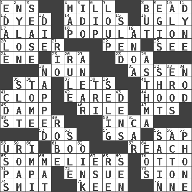 ACROSS 1. Followers of ems 4. Place where flour is made 8. Necklace unit 12. Colored 14. Goodbye (Sp.) 16. Unsightly 17. Jai ____ 18. Census information 20. Failure 22. Writing instrument 23. Observe 24. Compass dir. 25. Lyricist Gershwin 28. ___ good deed 30. Part of speech 31. NE Netherlands city 35. R.R. building 37. Allows 40. Through, poetically 41. Hoof sound 42. Having ears or earlike features 44. Parka part 45. Moist 46. Cause heat under the collar 47. Mountains (abbr.) 48. Bull 50. South American Indian 52. Two (Sp.) 54. Girls' org. (abbr.) 55. Plant excrement 58. RI univ. 61. Surprise greeting 63. Arrive at 65. Wine waiters 70. Von Bismarck 71. Dad 72. Follow as a consequence or result 73. The Jewish people; Israel 74. Stricken, poetically 75. Peachy ____! 76. Compass dir. DOWN 1. Peak District village in England 2. High-strength synthetic material 3. Gospel singer Marvin 4. Atlas unit 5. Wedding promise 6. Mouth edge 7. Central Nebraska county 8. Yet 9. The front part of a cuirass 10. _ vera 11. Unit of force 13. Pass on 15. Downhill vehicle 19. Small Philippine buffalo 21. River (Sp.) 26. Governing power 27. Approach 29. Respiratory problem 30. Slept 32. Guess 33. Greek god of love 34. Lower and raise head in agreement 35. Narrow board 36. Heavy book 38. Three (prefix) 39. Former Milwaukee Brewers owner Bud 41. Music discs 43. Lairs 49. Loose flowing garment 51. Automobile 53. Flatfish 55. Smooth fabric 56. Gambison 57. Give a jingle 58. United States Postal Service (abbr.) 59. Wander aimlessly 60. Body of Kaffir warriors 62. Pig sound 64. Greek goddess of the dawn 66. Floor protector 67. Compass dir. 68. Regret 69. Elected rep.