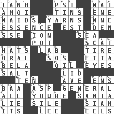 ACROSS 1. Hyperbolic tangent 5. Air pressure measure (abbr.) 8. Floor protector 11. Mine, in Marseilles 12. Airtight sealed metal containers 14. Compass dir. 15. Women servants 17. Tall tales 18. Compass dir. 19. Core 21. Eastern Standard Time (abbr.) 22. Lair 23. Compass dir. 24. Electrically charged atom 25. Ocean 27. Plant holder 28. Jazz singing style 31. Floor coverings 35. Experiment locale 37. Hoop that covers a wheel 38. Of the mouth 39. Distress signal 41. Singer James 42. Actor Lugosi 43. Lubricate 45. Snake ____ (dice throw) 46. Table seasoning 47. Hat (slang) 49. "___ Little Indians" 51. "___ Maria" 52. Followers of ems 55. Sound made by sheep 57. Viper 60. Commissioned military rank 62. Everything 63. You are 65. Before Barbara or Clara 66. Whopper 67. Drop; flow; fall 68. Thailand, formerly 69. It is 70. Area sheltered from the wind 71. Snakelike fish DOWN 1. Corrects by punishment or discipline 2. Collect or gather 3. Annoying sound 4. Flintstone garb 5. Parent Teacher Association (abbr.) 6. Beget 7. Restaurants 8. Ananias' fault 9. Queen of England 1702-14 10. Adolescent 13. Fast planes 16. Sever or remove by pinching or nipping 17. Gossips 20. Calm and collected 26. First name in cosmetics 29. Johnson of "Laugh-In" 30. Beverages made from leaves 31. Disorderly crowds 32. Type of rug 33. Baron Munchausen's specialties 34. Schedule 36. Sometimes accompanies a hiss 40. Fodder prepared in a silo 44. Not recorded 48. Cub Scout units 50. Negative votes 52. Bert's buddy 53. Relating to or accompanying birth 54. Criticizes harshly 55. Indonesian resort city 56. Set down 58. The visible part of the earth's surface 59. Whine 61. Comfort 64. To separate or throw off