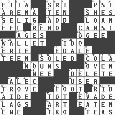 ACROSS 1. Singer James 5. _ Lanka 8. 23rd letter of the Greek alphabet 11. Sports stadium 13. "___ Little Indians" 14. "______ My Girl" (Turtles hit) 15. Major League Baseball Commissioner Bud 16. Say or write further 17. Grant temporary use of 18. Snakelike fish 19. Western Nevada city 21. 2nd pers. sing. pres. of can (arch.) 22. Eons 24. Double curve, resembling the letter S 25. Place for singles 27. Wedding promise 29. One of the Great Lakes 30. Peak District village in England 32. Adolescent 33. Having a sole or soles 35. Root beer relative 39. Parts of speech 41. Baking chamber 42. Born 43. Keyboard key 45. Actor Baldwin 48. One who makes use of a thing 49. Collection of objects 50. One third of a yard 52. To free from 55. Assistant 56. Small child 57. Elude 59. Falls behind 60. Nonscientific branch of learning 61. Eroded 62. Compass dir. 63. Ring climax 64. Afternoon social gatherings DOWN 1. Comfort 2. Family _ (genealogy) 3. Copy Pinocchio 4. Black tropical American cuckoo 5. Comedian Laurel of Laurel & Hardy 6. Redecorate 7. Indiana (abbr.) 8. Give a jingle 9. Gospel singer Marvin 10. Is not 12. Match 14. Volcanic refuse 20. Eastern Standard Time (abbr.) 21. Calm and collected 23. American astronaut and politician John 25. Dripping 26. "We ___ not amused" (Victoria) 27. Binary compound 28. June honoree 30. Raised railways 31. Learning spot: Fr. 33. Institute legal proceedings 34. Single 36. Make much ado about nothing 37. Allow 38. One (Scot) 40. At one time in the past 43. Superhero pair 44. First name in cosmetics 45. Believer in; advocate of (suffix) 46. Cabin 47. Nights before holidays 49. Story 50. Tined utensil 51. Von Bismarck 53. The main thing one is thinking about 54. Hiding places for outlaws 56. Make lace 58. Large container