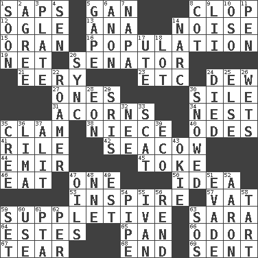 ACROSS 1. Plant excrements 5. Separate the seeds from cotton 8. Hoof sound 12. Stare 13. Santa ___, CA 14. Annoying sound 15. Northwest Algerian city 16. Census information 19. Fish or hair follower 20. Elected representative 21. Suggestive of the supernatural 23. And so on (abbr.) 24. Morning condensation 27. Singles 30. Filth; sediment 31. Oak nuts 34. A home for chicks 35. Burrowing marine mollusk 38. Sibling's daughter 40. Lyric poems 41. Cause heat under the collar 42. Manatee 44. Arab leader 45. Puff or smoke 46. Consume 47. Single 50. It may be bright or harebrained 53. Motivate 57. Large container 59. Supplementary 63. "Two Mules for Sister ____" 64. _____ Park, CO 65. Baking dish 66. Scent 67. Separate forcefully 68. Conclusion 69. Posted DOWN 1. Within a short period 2. Match 3. Food holder 4. Elected rep. 5. Stare wonderingly 6. At once, immediately (arch.) 7. California wine valley 8. Small bed 9. Cards in a Roman deck? 10. Bear (Spanish) 11. Fenced enclosure 14. Drug cop 17. Shoshoni 18. Car dealer's back yard 20. Synchronize (abbr.) 22. Nomad 24. Passed on 25. Otherwise 26. Soaks 28. A really long time 29. Indian titles of respect 30. Overwhelmed 32. Born 33. Scram! 35. Algonquian 36. Pale green bean 37. Came down and settled, as after flight 39. Environmental prefix 43. Migrant worker of the '30s 47. Petroleums 48. Compass dir. 49. Eastern Standard Time (abbr.) 51. Elude 52. Composer Copland 54. Corncob 55. "Terrible" tsar 56. Tear apart 58. Small pie 59. Arrange properly for use 60. Purpose 61. Parent Teacher Association (abbr.) 62. For each 63. Distress signal