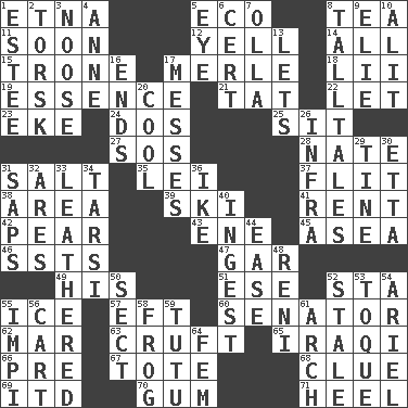 ACROSS 1. Inactive volcano in Sicily 5. Environmental prefix 8. Afternoon social gathering 11. Within a short period 12. Shout 14. Everything 15. Heavy duty weighing machine 17. Haggard of country music 18. Cards in a Roman deck? 19. Gist 21. Make lace 22. Allow 23. Make supply last 24. Two (Sp.) 25. Be seated 27. Mayday 28. Nathan's nickname 31. Table seasoning 35. Luau accessory 37. Sudden quick movement 38. Length times width 39. What Jean-Claude Killy likes to do 41. Monthly bill 42. Lightbulb-shaped fruit 43. Compass dir. 45. Toward the sea 46. Fast planes 47. Slender fish 49. Part of HMS, perhaps 51. Compass dir. 52. R.R. building 55. Frozen water 57. Bank Draft (abbr.) 60. Elected representative 62. Third mo. 63. An unpleasant substance 65. Resident of Iraq 66. Before (prefix) 67. Haul 68. A slight indication 69. It would 70. Chewing product 71. The bottom of a shoe or boot DOWN 1. First name in cosmetics 2. Cod relative 3. Trap for birds or small mammals 4. Queen of England 1702-14 5. Sight organ 6. Certainty 7. Spanish pot 8. Baron Munchausen's specialties 9. Writer Wiesel 10. Came down and settled, as after flight 13. Allows 16. Extremities 17. Makes clutter 20. Calm and collected 26. Kind of red light 29. Prong on a fork 30. Singer James 31. Plant excrements 32. Ancient Greek god of war 33. Resembling or made to resemble leather 34. Tarsus (plural) 36. Mamie's mate 40. Eat 44. Relaxation 48. Painter Guido (1575-1642) 50. Religious group 52. Showing deterioration from age 53. Woman's close-fitting hat 54. Satellite of Uranus 55. Body of Kaffir warriors 56. Heavy open wagon 58. Toadlike animal 59. Ballerina skirt 61. Bowlike part 64. Opposite of masc.