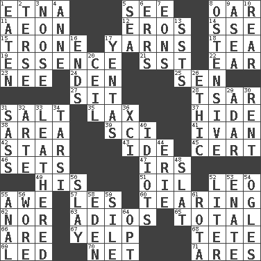 ACROSS 1. Inactive volcano in Sicily 5. Perceive with the eye 8. Rowing implement 11. Period of immesurable duration 12. Greek god of love 14. Compass dir. 15. Heavy duty weighing machine 17. Tall tales 18. Afternoon social gathering 19. Core 21. Fast jet (abbr.) 22. Ewer handle 23. Born 24. Lair 25. Elected rep. 27. Be seated 28. Russian ruler of old 31. Table seasoning 35. Not strict 37. Flintstone garb 38. Type of rug 39. _-fi 41. _ the terrible 42. Play the lead 43. Binary compound 45. An absolute certainty 46. Puts into a specified state 47. Big collection agency 49. Part of HMS, perhaps 51. Lubricate 52. Lion 55. Deep reverence 57. French article 60. Pulling into pieces 62. Not either 63. Goodbye (Sp.) 65. Add up to 66. "We ___ not amused" (Victoria) 67. Sharp bark 68. Wig 69. Directed 70. Fish or hair follower 71. Ancient Greek god of war DOWN 1. Eroded 2. Laconic 3. Trap for birds or small mammals 4. Queen of England 1702-14 5. Ocean 6. Blunders 7. Immeasurably long periods of time 8. Clearly or manifestly demonstrative 9. Toward the sea 10. Located in or toward the back 13. Fast planes 16. Extremities 17. Gossips 20. To provide with a ceiling 26. Principle of right and wrong 29. The sixth month of the Jewish calendar 30. Monthly bill 31. Backtalk 32. Johnson of "Laugh-In" 33. Tough but pliablecoriaceous 34. Tarsus (plural) 36. One more than ninety 40. Foolish or stupid persons 44. One of the Great Lakes 48. Narrow board 50. Kill 52. 61 cubic inches 53. Related on the mother's side 54. Stares at amorously 55. Of or related to the anus 56. Had on 58. Paradise 59. Filth; sediment 61. Round or rotation of duties 64. Choose