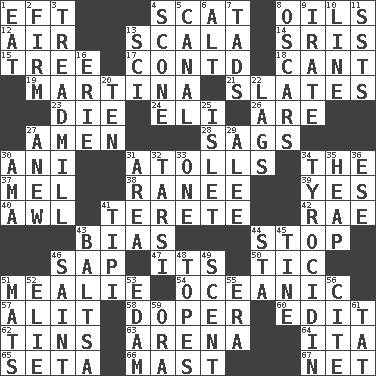 ACROSS 1. Bank Draft (abbr.) 4. Leave at once 8. Lubricates 12. Atmosphere 13. Any of the three canals of the cochlea 14. Indian titles of respect 15. Woody plant 17. Continued (abbr.) 18. Patter 19. Chrissie's court nemesis 21. Chalkboards 23. Pass on 24. Biblical high priest 26. "We ___ not amused" (Victoria) 27. So be it 28. Droops 30. Cuckoo 31. Ringlike coral islands and reefs 34. Definite Article 37. Cartoonist voice _ Blanc 38. Indian princess (variant) 39. Consenting reply 40. Leather borer 41. Cigar-shaped 42. Actress Charlotte 43. Prejudice 44. Constrict 46. Plant excrement 47. ___ a Wonderful Life 50. Nervous spasm 51. Ear of corn 54. Pertaining to the sea 57. Set down 58. Drug addict 60. Prepare for publication 62. Metal containers 63. Sports stadium 64. Call ___ day 65. Stalk of a moss capsule 66. Vertical spar for supporting sails 67. Remaining after all deductions DOWN 1. Erode 2. Become taut 3. Excercise machine 4. Biscuitlike quick bread 5. Lessep's creation 6. Keyboard modifier key 7. Small boys 8. Motion picture awards 9. Feeling or showing extreme anger 10. Actor's bit 11. Fast planes 13. _-fi 16. One of the Great Lakes 20. Nine, plus one 22. Fails to keep up a pace 25. Small island 27. Afresh 29. Toward shelter 30. Wet nurse (var.) 31. Length times width 32. Tarsus (plural) 33. Single 34. Polypeptide antibiotic 35. Pile 36. Compass dir. 41. Native american tent (variation) 43. Greek mezzo-soprano Agnes 44. R.R. building 45. Prong on a fork 46. Inhabitant of Heaven 48. Drinks excessively 49. Aroma 51. Floor protectors 52. Writer Wiesel 53. Dutch treat 55. Epoch 56. Quote 59. Mouth or opening 61. Make lace