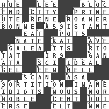 ACROSS 1. Regret 4. Area sheltered from the wind 7. Alliance 11. Conclude 12. Municipality 13. First class 14. Shoshoni 15. French philosopher Descartes 16. Nomad 17. Maid-servant 19. Helper 21. Erode 23. Plant holders 24. Nathan's nickname 25. Krazy ___ of comics 26. "___ Maria" 29. An organ shaped like a helmet 30. It is 31. River (Sp.) 32. Make lace 33. Big collection agency 34. Separate the seeds from cotton 35. _ moment's notice (2 wds.) 36. _-fi 37. Standard of perfection 40. Set 41. Car or cant ending 42. 1994 drama film starring Jodie Foster 43. Examine minutely or intensely 45. White ___ sheet 46. Determination 51. Silly 55. Foolish or stupid persons 56. Horse sense 58. Not either 59. Impressive in appearance 60. Penny 61. Fr. "Yes" 62. Celtic language 63. Connecticut Ivy Leaguer 64. Compass dir. DOWN 1. Reuben's nickname 2. To (old English) 3. Genesis locale 4. Whopper 5. Inactive volcano in Sicily 6. Snake ____ (dice throw) 7. Naughty children 8. Pale green bean 9. Presage 10. An absolute certainty 12. Make 13. Mail 16. Disturbances 18. Actress Patricia 20. Arguments over trivial matters 22. Beverage made from leaves 24. Relating to or accompanying birth 25. Japanese brewing company 26. Therefore, facetiously 27. Small bottle 28. A really long time 29. Yard entry 32. Label 33. Ancient Celtic tribe of eastern Britain 36. Theater features 37. _ tizzy (2 wds.) 38. Cease 39. Style 43. Took without asking 44. Quote 46. Trig term 47. Scent 48. Chest bones 49. At one time in the past 50. Christmas carol 52. At once, immediately (arch.) 53. Part of speech 54. 4th largest of the Great Lakes 57. University (slang)