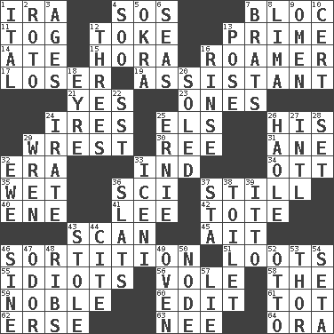 ACROSS 1. Retirement account (abbr.) 4. Mayday 7. Coalition 11. Coat; cloak 12. Casino tip 13. First class 14. Had dinner 15. Israeli folk dance 16. Nomad 17. Failure 19. Aide 21. It is so 23. Singles 24. Angers 25. Raised railways 26. Part of HMS, perhaps 29. Obtain by seizing forcibly or violently 30. Portuguese money of account (variant) 31. One (Scot) 32. Period 33. Indiana (abbr.) 34. Baseball player Mel 35. Dripping 36. _-fi 37. Free from disturbance or agitation 40. Compass dir. 41. Area sheltered from the wind 42. Carryall 43. Examine minutely or intensely 45. Small island 46. Drawing lots 51. Plunders 55. Foolish or stupid persons 56. Grand slam 58. Definite Article 59. Impressive in appearance 60. Prepare for publication 61. Small child 62. Celtic language 63. Born 64. Mouth or opening DOWN 1. Slanted text style (abbr.) 2. Printing process, for short 3. Grows older 4. "Barney Miller" actor Jack 5. Gumbo ingredient 6. Oceans 7. Naughty children 8. Pale green bean 9. Sign of things to come 10. An absolute certainty 12. Trios 13. Introduce or present, as a question 16. Wash lightly 18. Jane of fiction 20. Having a sole or soles 22. Fast jet (abbr.) 24. Feeling or showing extreme anger 25. Bert's buddy 26. White Person, in Hawaii 27. International (abbr.) 28. Arrange properly for use 29. Songbird 32. She-sheep 33. Ancient Celtic tribe of eastern Britain 36. Narrow boards 37. R.R. building 38. Bathroom plumbing fixture 39. "Tell ____ the Marines!" 43. Fur scarf 44. Quote 46. Trig term 47. Aroma 48. Chest bones 49. Baking chamber 50. Connecting point 52. Von Bismarck 53. Son of Odin 54. Stalk of a moss capsule 57. Untruth