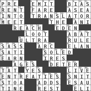 ACROSS 1. Before (prefix) 4. Send forth 8. Prejudice 12. Monthly bill 14. Conductor's collection 15. Toward the sea 16. To the inside or interior of 17. Interpreter 20. Rendezvous 21. Definite Article 22. Cuckoo 23. Arrive at 27. Locale of original sin 29. Plunder 31. Blind as ____ 34. Extremist 35. Governing power 36. Backtalk 39. Curve 41. Liveliness 42. Suttee (variant) 43. Having a sole or soles 46. Merit 47. Angers 48. Ripens 51. Prevent from occurring 54. Make lace 56. Affirmative reply 58. Not recorded 61. Pleas 66. In a ____ (agitated or irritated) 67. Portico 68. Does sums 69. He sold his birthright 70. Prong on a fork 71. Remainder 72. Connecticut Ivy Leaguer DOWN 1. Demure 2. French philosopher Descartes 3. Keyboard key 4. Bank Draft (abbr.) 5. Spoil 6. Lyricist Gershwin 7. Portable shelter 8. Sound made by sheep 9. Byzantium, centuries later 10. A really long time 11. Indian skirt 13. Carry 18. A female animal or person 19. Directed 24. Everything 25. Small bed 26. Israeli folk dance 28. Having ears or earlike features 30. Tarsus (plural) 32. Insect wing 33. "___ Little Indians" 34. Exploiting 36. Compass dir. 37. Auto club (abbr.) 38. Ski resort town in Vermont 40. Drawstring 44. Area sheltered from the wind 45. Eastern Standard Time (abbr.) 49. Sight organ 50. Ocean 52. Otherwise 53. Wash lightly 54. Trial 55. Opposed to 57. Play the lead 59. Small bottle 60. Needle case 62. Actress Charlotte 63. Binary compound 64. Begley and Asner 65. Fast jet (abbr.)