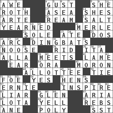 ACROSS 1. Deep reverence 4. Abrupt rush of wind 8. A female animal or person 11. Writer of Portnoy's Complaint (1969) 13. Toward the sea 14. "______ My Girl" (Turtles hit) 15. Johnson of "Laugh-In" 16. 480, 500 or 516 sheets of paper 17. Table seasoning 18. Had a strong desire 21. Haggard of country music 22. Not divided or shared with others 23. Had dinner 25. Two (Sp.) 26. Curve 29. Empty-headed or silly people 32. Trap for birds or small mammals 34. To free from 35. Call ___ day 38. Silent film actress Nazimova 39. Confronts 41. Unable to walk 43. Ewer handle 44. Mouth or opening 45. Person of subnormal intelligence 46. One to whom something is allotted 50. Standoff 51. Enemy 54. It is so 55. Coop moms 57. Bert's buddy 59. Motivate 63. One who doesn't tell the truth 64. Small, secluded valley 67. Roberta Peters solo 68. Globular water bottle used in Asia 69. Shout 70. Confederate soldiers (slang) 71. One (Scot) 72. More than one (prefix) 73. Fast jet (abbr.) DOWN 1. Like ___ of sunshine 2. Had on 3. Singer James 4. Place where plants grow 5. Purpose 6. Ocean 7. Scottish cap 8. Broken piece 9. Phone greeting 10. _____ Park, CO 12. Possessive pronoun 14. Compass dir. 19. Thickened enlargement 20. Biblical high priest 21. Was introduced to 23. "This won't hurt ____!" 24. Small boys 26. Santa ___, CA 27. Hero or heavy, e.g. 28. Root beer relative 30. Relatively large 31. Grain storage tower 33. "Two Mules for Sister ____" 36. Small pie 37. Mine, in Marseilles 39. Undercover agent 40. Greek god of love 42. Compass dir. 45. Not women's 47. Potassium hydroxide 48. Without thickness 49. Car or cant ending 51. Man or boy (slang) 52. Constellation of myth 53. Related on the mother's side 56. Practice fight 58. Retirement account (abbr.) 60. Angers 61. Teases 62. 90 degrees 64. Flimflam 65. Lion 66. Pipe bend