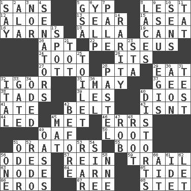 ACROSS 1. Without 5. Hustle 8. For fear that 12. _ vera 13. Shrivel 15. Toward the sea 16. Tall tales 18. Silent film actress Nazimova 19. Patter 20. Fitting 22. Son of Zeus who helped slay Medusa 24. A blast of a horn 26. ___ a Wonderful Life 27. "Beetle Bailey" pooch 28. Parent Teacher Association (abbr.) 29. Erode 32. Composer Stravinsky 35. "If ____ say so..." 37. Unit of force equal to gravity 38. Small boys 39. French article 40. "Vaya con ____" 41. Had dinner 42. Waist strap 43. Is not 44. Directed 45. Was introduced to 46. Blunders 49. Clumsy lout 50. Plunder 51. Speakers 55. Surprise greeting 56. Lyric poems 57. It's straight from the horse's mouth 59. Hang back 63. Connecting point 64. Merit 65. Periodic rise and fall of the sea level 66. Greek god of love 67. To separate or throw off 68. Proofreading order DOWN 1. Declare 2. According to 3. Not either 4. Legislators 5. Girls' org. (abbr.) 6. Sharp bark 7. Light colored 8. Shoestrings 9. He sold his birthright 10. Elected reps. 11. Make lace 14. Noteworthy scarcity 17. Specific locale 21. Small child 23. R.R. building 25. Bathroom 28. Soft color 29. The front part of a cuirass 30. Period of immesurable duration 31. Trial 32. Slanted text style (abbr.) 33. Yard entry 34. Wrote a lyric poem 36. Cartoonist voice _ Blanc 40. What propaganda does 42. Prior to 45. Floor protector 47. Director Reiner 48. Carrot, for example 49. Fertile tracts in a desert 51. Aroma 52. Make new 53. Stern 54. Beget 56. Single 58. Compass dir. 60. Small island 61. Binary compound 62. Allow