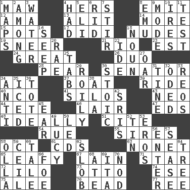 ACROSS 1. Informal term for the mouth 4. Possessive pronoun 8. Send forth 12. Nursemaid (var.) 13. Came down and settled, as after flight 14. Greater amount 15. Cooking vessels 17. "You Light Up My Life" star Conn 18. Unclothed pictures 19. Contemptuous expression 21. _ de Janeiro 23. Eastern Standard Time (abbr.) 24. Relatively large 26. Superhero pair 28. Lightbulb-shaped fruit 30. Legislator 34. Small island 37. Water vessel 39. Travel on an animal 40. Non-commissioned officer (abbr.) 41. Grain storage towers 43. Modern: prefix 44. Wig 46. Den 47. Begley and Asner 48. Under perfect conditions 51. Quote 54. Sorrow 55. Titles for men of rank and authority 58. Sep. follower 61. Music discs 63. Music written for nine 65. Like summer trees 67. (Had) reclined 71. Play the lead 72. _ and Stitch 73. "Beetle Bailey" pooch 74. Compass dir. 75. Toward shelter 76. Necklace unit 77. To separate or throw off DOWN 1. Atlas contents 2. Amid 3. Wetness 4. Possessed 5. Connecticut Ivy Leaguer 6. To free from 7. Use a spoon 8. Australian flightless bird 9. Method 10. Angers 11. Trial 16. Ooze 18. Part of speech 20. Actress Charlotte 22. Binary compound 25. Bar bills 27. Rowing implement 29. Agitated, as a liquid 30. Unemotional 31. Prong on a fork 32. Wrote a lyric poem 33. Vintage cars 34. Against 35. On the rocks 36. Haul 38. Insect wing 42. Indian titles of respect 45. Ewer handle 49. "I Love _" 50. Directed 52. Metal container 53. Greek god of love 56. Keyboard key 57. Gospel singer Marvin 58. Spanish pot 59. To provide with a ceiling 60. Lie 62. Oscar Madison type 64. Family _ (genealogy) 66. Enemy 68. Had dinner 69. Call ___ day 70. Dreamland