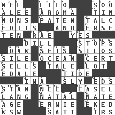 ACROSS 1. Cartoonist voice _ Blanc 4. _ and Stitch 8. "Barney Miller" actor Jack 11. Toward shelter 13. Scent 15. Shallow baking pan 16. Religious women 17. Eucharist need 18. Baby powder 19. Prepares for publication 21. Also 22. Celtic language 23. Nine, plus one 24. Actress Charlotte 27. Affirmative reply 29. Deli pickle 30. Ceases 34. Simpleton 36. Arranges properly for use 39. Grain storage towers 40. Filth; sediment 41. Sea 43. Certainty 44. Exchanges for money 46. Story 47. Car dealer's back yard 48. Peak District village in England 49. Periodic rise and fall of the sea level 51. _ tizzy (2 wds.) 53. Wily 54. Begley and Asner 57. Comedian Laurel of Laurel & Hardy 60. Born 63. Artist's stand 65. Long (Scottish) 66. Relating to or accompanying birth 69. Nathan's nickname 70. Ripen 71. Bert's buddy 72. Supplemented with great effort 73. Compass dir. 74. Suttee (variant) 75. Big collection agency DOWN 1. French painter Edouard 2. Dodge 3. Soviet premier 1918-24 4. Pet locale 5. Lyricist Gershwin 6. Globular water bottle used in Asia 7. Sign of something about to happen 8. Play the lead 9. Petroleums 10. At one time in the past 12. Eastern Standard Time (abbr.) 14. Actor Griffith 18. One of the two male reproductive glands 20. Indian title of respect (Mr.) 25. In addition 26. Opt 28. Curvy letter 29. Residence 31. Butter sub 32. Sweet dark-red dessert wine 33. Fast jet (abbr.) 34. Passed on 35. Silent film actress Nazimova 37. Afternoon social gathering 38. Table seasonings 40. Compass dir. 42. Famous astronaut Armstrong 45. Elected rep. 50. Color 52. Singer Murray 54. 1973 Nobel Price Winner (Physics) Leo 55. Prevent from occurring 56. Bobsleighs 57. Cole _ (cabbage dish) 58. Labels 59. Afresh 61. Hearing organs 62. Inactive volcano in Sicily 64. One (Scot) 67. Small island 68. Luau accessory