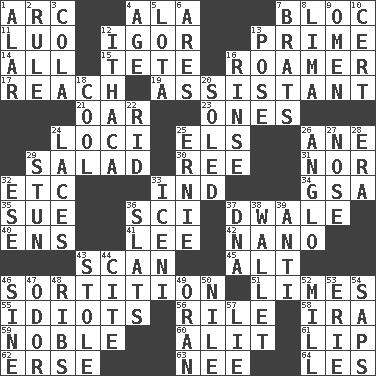 ACROSS 1. Curve 4. In the manner of 7. Coalition 11. Nilotic language 12. Russian composer Stravinsky 13. A-one 14. Everything 15. False hair 16. Nomad 17. Arrive at 19. Helper 21. Boat paddle 23. Singles 24. Event scenes 25. Raised railways 26. One (Scot) 29. First course 30. To riddle 31. And not 32. And so on (abbr.) 33. Working for oneself (abbr.) 34. Girls' org. (abbr.) 35. Institute legal proceedings 36. _-fi 37. A sleeping potion; an opiate (poet.) 40. Followers of ems 41. Area sheltered from the wind 42. Billionth: prefix 43. Glance over 45. Keyboard modifier key 46. Conclusion 51. Citrus fruits 55. Foolish or stupid persons 56. Cause heat under the collar 58. Retirement account (abbr.) 59. Impressive in appearance 60. Set down 61. Mouth edge 62. Celtic language 63. Born 64. French article DOWN 1. Having or resembling wings 2. General guideline 3. Root beer relative 4. Grow older 5. Globular water bottle used in Asia 6. Ancient Greek god of war 7. Naughty children 8. Pale green bean 9. Sign of something about to happen 10. Sure thing 12. New York city 13. Introduce or present, as a question 16. Remove soap 18. Calm and collected 20. Having a sole or soles 22. To free from 24. Shoestrings 25. Bert's buddy 26. White American of non-Hispanic descent 27. Characteristic smell of wine 28. Epoch 29. Make senseless or dizzy 32. Compass dir. 33. Ancient Celtic tribe of eastern Britain 36. Narrow boards 37. Heredity factor (abbr.) 38. Place for singles 39. Opposed to 43. Fur scarf 44. Quote 46. Trig term 47. Aroma 48. Chest bones 49. Northwest Algerian city 50. The longest river in the world 52. Place where flour is made 53. 4th largest of the Great Lakes 54. Plant excrements 57. Whopper