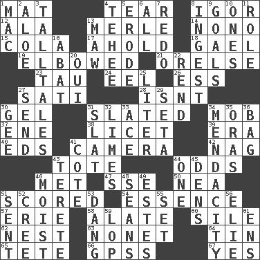 ACROSS 1. Floor protector 4. Rend 8. Composer Stravinsky 12. In the manner of 13. Haggard of country music 14. Words to Nanette 15. Root beer relative 17. Hold, grip (Informal) 18. Highlander 19. Turned at an angle; bent 21. Threatening words 23. The 19th letter of the Greek alphabet 24. Snakelike fish 26. Double-curved letter 27. Suttee (variant) 28. Is not 30. Set 31. Scheduled 34. Disorderly crowd 37. Compass dir. 38. It is permitted: Lat. 39. Epoch 40. Begley and Asner 41. Device for capturing images 42. Tired old horse 43. Carry 44. Probability 46. Was introduced to 47. Compass dir. 50. Teachers' org. 51. Tallied 54. Core 57. 4th largest of the Great Lakes 58. Having winglike extensions 60. Drop; flow; fall 62. Egg locale 63. Music written for nine 64. Metal container 65. Wig 66. Global Positioning Systems (abbr.) 67. It is so DOWN 1. Apple computer (short form) 2. _ vera 3. Baron Munchausen's specialties 4. Giggle 5. Wear away 6. 100% 7. Redecorate 8. Consume 9. Purposes of endeavors 10. Washington bills 11. Hero or heavy, e.g. 13. Informal term for the mouth 16. Blind as ____ 20. Fr. "Yes" 22. Tear apart 25. 61 cubic inches 27. Transmit 29. Bristle 30. Turn to the right 31. Narrow board 32. Citrus fruits 33. Adept person 34. Ananias' fault 35. Mouths or openings 36. Container for groceries 41. ____ d'Azur (French Riviera) 43. Cigar-shaped 44. Single 45. Cub Scout units 46. Wet 48. Actors Connery and Penn 49. _____ Park, CO 51. Transmitted 52. Algonquian 53. Mild oath, euphamism for damn 55. Put into a specified state 56. Writer Wiesel 59. Chop off 61. Followers of ems