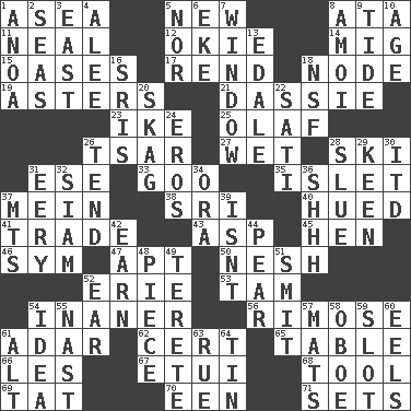 ACROSS 1. At sea 5. ___ Haven, CT 8. "One Day ___ Time" 11. Anneal 12. Migrant worker of the '30s 14. Russian fighter aircraft 15. Fertile tracts in a desert 17. Tear apart 18. Thickened enlargement 19. Michaelmas daisies 21. Small ungulate mammals of Africa 23. Eisenhower's nickname 25. Norwegian king 26. Russian ruler of old 27. Soggy 28. What Jean-Claude Killy likes to do 31. Compass dir. 33. Thick or sticky substance 35. Small island 37. Chow _ 38. _ Lanka 40. Took on color 41. Swap 43. Viper 45. Layer 46. Symbol (abbr.) 47. Fitting 50. Soft 52. 4th largest of the Great Lakes 53. Scottish cap 54. Sillier 56. Full of chinks, cracks, or crevices 61. The sixth month of the Jewish calendar 62. An absolute certainty 65. Eating place 66. French article 67. Needle case 68. Utensil 69. Make lace 70. Car or cant ending 71. Arranges properly for use DOWN 1. Small Philippine buffalo 2. Oceans 3. Compass direction 4. Toward shelter 5. And not 6. Make supply last 7. Light entry point 8. Mine, in Marseilles 9. Periodic rise and fall of the sea level 10. Mature 13. Peak District village in England 16. Indian titles of respect 18. Science/research agcy. 20. Heroin 22. Suttee (variant) 24. Greek god of love 26. Be inclined (to) 28. Turn sharply 29. Peachy ____! 30. It would 31. Suggestive of the supernatural 32. Thailand, formerly 34. Mouth or opening 36. Quiet! 37. Mountains (abbr.) 39. Is not 42. Merit 44. Lightbulb-shaped fruit 48. Component 49. Cigar-shaped 51. Stricken, poetically 52. Hearing organ 54. The content of cognition 55. Political cartoonist Thomas 57. Floor coverings 58. Mitch Miller's instrument 59. Notch 60. Snakelike fish 61. The first octave above the treble staff 63. Sorrow 64. Shallow baking pan
