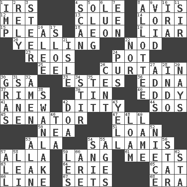 ACROSS 1. Big collection agency 4. Not divided or shared with others 8. Advice 12. Was introduced to 13. A slight indication 14. Australian parrot (variant) 15. Entreaties 18. A really long time 19. One who doesn't tell the truth 20. Crying or shouting loudly 22. Allow head to fall sleepily 23. Vintage cars 24. Cooking vessel 25. Snakelike fish 26. Window treatment 30. Girls' org. (abbr.) 33. _____ Park, CO 36. Pulitzer Prize-winning author Ferber 37. Basketball hoops 39. Metal container 40. Whirlpool 41. Afresh 42. Simple song 44. Distress signal 45. Elected representative 47. Pipe bend 50. Teachers' org. 51. Grant temporary use of 53. Wing 54. Deli grouping 57. Silent film actress Nazimova 59. Long (Scottish) 61. Confronts 63. Path through which fluid escapes 64. One of the Great Lakes 65. Domesticated feline 66. Actor's bit 67. Puts into a specified state 68. Epoch DOWN 1. Mischievous child 2. Depend 3. Navigate 4. Glance over 5. Cassini of fashion 6. Nilotic language 7. Car or cant ending 8. One to whom something is allotted 9. Null 10. Retirement account (abbr.) 11. Title for a knight 16. Toward shelter 17. A type of plum 21. Capri or Wight 22. Not either 24. Fluid product of inflammation 26. Penny 27. Sums up 28. _ china 29. Negative votes 30. Pate de foie ____ 31. Trig term 32. So be it 34. Agitate 35. Teat (slang) 38. Tchaikovsky ballet 42. ___ good deed 43. Shout 46. Afternoon social gathering 48. Rich soil 49. Unable to walk 52. Sibling's daughter 53. Actor Alda or Thicke 54. In a ____ (agitated or irritated) 55. Eons 56. Play the lead 57. 100% 58. Flowery wreath 59. French article 60. "We ___ not amused" (Victoria) 62. R.R. building