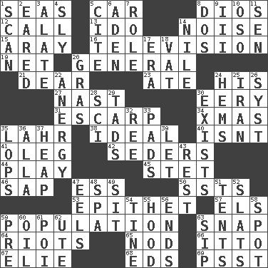 ACROSS 1. Oceans 5. Auto 8. "Vaya con ____" 12. Give a ring to 13. Wedding promise 14. Annoying sound 15. Like ___ of sunshine 16. Household entertainment appliance 19. Fish or hair follower 20. Commissioned military rank 21. Letter starter 23. Had dinner 24. Part of HMS, perhaps 27. Political cartoonist Thomas 30. Suggestive of the supernatural 31. Fortification 34. Dec. holiday 35. Cowardly lion portrayer 38. Standard of perfection 40. Is not 41. Cassini of fashion 42. Spring feasts 44. Romp 45. Proofreading order 46. Plant excrement 47. Curvy letter 50. Fast planes 53. Curse 57. Raised railways 59. Census information 63. Fastener 64. Debaucheries 65. Dreamland 66. "Tell ____ the Marines!" 67. Writer Wiesel 68. Begley and Asner 69. Inconspicuous attention getter DOWN 1. Glance over 2. Having ears or earlike features 3. Having winglike extensions 4. Insidious 5. Quote 6. An important port of Yemen 7. Hero or heavy, e.g. 8. Two (Sp.) 9. One more than two 10. Bear (Spanish) 11. Elected rep. 14. Mediterranean tributary 17. Period 18. Large container 20. Pate de foie ____ 22. Disorder of the immune system 24. Folds over and sews together 25. SW Asia republic 26. System (abbr.) 28. _-fi 29. Bits 30. Has an existence 32. Portuguese money of account (variant) 33. Groovy apts. 35. Chops off 36. Silent film actress Nazimova 37. Pile 39. Allow 43. Take ten 47. Snakelike fish 48. Health resort 49. Be seated 51. Portable shelters 52. Narrow boards 54. Prong on a fork 55. Parka part 56. Extremities 58. Blemish 59. Before (prefix) 60. Petroleum 61. Luau course 62. Shoshoni 63. Small drink