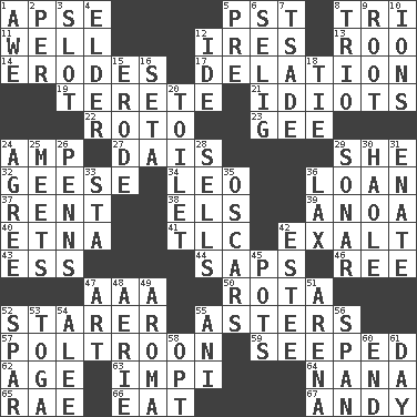 ACROSS 1. Domed church section 5. Pacific Standard Time (abbr.) 8. Three (prefix) 11. Not ill 12. Angers 13. Friend of Pooh 14. Eats (away) 17. Accusation by an informer 19. Cigar-shaped 21. Foolish or stupid persons 22. Printing process, for short 23. Turn to the right 24. Electrical Unit 27. Raised platform 29. A female animal or person 32. Honkers 34. Lion 36. Grant temporary use of 37. Monthly bill 38. Raised railways 39. Small Philippine buffalo 40. Inactive volcano in Sicily 41. Affectionate concern, for short 42. Glorify 43. Curvy letter 44. Plant excrements 46. Portuguese money of account (variant) 47. Auto club (abbr.) 50. Round or rotation of duties 52. A viewer who gazes fixedly 55. Michaelmas daisies 57. Characterized by complete cowardliness 59. Oozed 62. Ripen 63. Body of Kaffir warriors 64. Nanny 65. Actress Charlotte 66. Consume 67. "60 Minutes" Commentator Rooney DOWN 1. Deep reverence 2. For each 3. Slit 4. A person who is older than you are 5. Before (prefix) 6. Major League Baseball Commissioner Bud 7. Sadhe (variant) 8. Musical group of three 9. Carrot, for example 10. Charged particles 12. Binary compound 15. Wear away 16. Stalk of a moss capsule 18. Standoff 20. Bathroom 24. Match 25. Confronts 26. Actor Sean's family 28. Makes a sale 29. Echolocation 30. White Person, in Hawaii 31. Related on the mother's side 33. R.R. building 35. Motion picture awards 36. Not strict 42. First name in cosmetics 45. Cooking vessels 47. Nonscientific branch of learning 48. Nest on high 49. Scent 51. Sports stadium 52. Coast Guard woman 53. Ancient Roman robe 54. Toward shelter 55. Black tropical American cuckoo 56. Connect, as a bridge 58. Choose 60. Conclusion 61. 24 hours