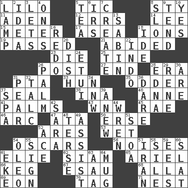ACROSS 1. _ and Stitch 5. Nervous spasm 8. Filthy place 11. Arabian gulf 12. Blunders 14. Area sheltered from the wind 15. Distance measurement 17. At sea 18. Charged particles 19. Went by 21. Stayed 23. Expire 25. Prong on a fork 26. Mail 27. Conclusion 28. Period 31. Parent Teacher Association (abbr.) 33. Attila the _ 35. More peculiar 37. Lick closed 38. _ tizzy (2 wds.) 40. Queen of England 1702-14 41. Insides of hands 43. Compass dir. 45. Actress Charlotte 46. Curve 47. _ moment's notice (2 wds.) 50. Celtic language 52. Ancient Greek god of war 53. Soggy 54. Motion picture awards 56. Annoying sounds 61. Writer Wiesel 62. Thailand, formerly 65. Satellite of Uranus 66. Cask 67. He sold his birthright 68. Silent film actress Nazimova 69. A really long time 70. Label 71. A home for chicks DOWN 1. Desk light 2. It may be bright or harebrained 3. Allows 4. Singles 5. Beverage made from leaves 6. Big collection agency 7. Cause to be 8. _ gin 9. Be inclined (to) 10. Affirmative reply 13. Unit of acoustic absorption 16. Do over again 18. Binary compound 20. Food container 22. Southeast Asian peninsula 24. Needle holder 26. Inside of hand 28. Pulitzer Prize-winning author Ferber 29. French philosopher Descartes 30. "We ___ not amused" (Victoria) 31. Lightbulb-shaped fruit 32. Baby powder 34. Compass dir. 36. Have the gumption 37. Health resort 39. Afresh 42. "Two Mules for Sister ____" 44. Songbird 48. Laconic 49. Help 51. Portico 52. Adept person 54. Margarine 55. Signal 57. SW Asia republic 58. Filth; sediment 59. Snakelike fish 60. Narrow board 61. Make supply last 63. American Automobile Association (abbr.) 64. Java container