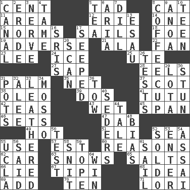 ACROSS 1. Penny 5. Bit 8. Domesticated feline 11. Length times width 12. 4th largest of the Great Lakes 14. Single 15. Typical models 17. Travels by water 18. Enemy 19. Contrary to your interests or welfare 21. Insect wing 22. Air blower 23. Area sheltered from the wind 24. Frozen water 25. Shoshoni 27. Plant excrement 28. Snakelike fish 31. Inside of hand 35. Remaining after all deductions 37. Native of Scotland 38. Margarine 39. Two (Sp.) 41. Ballerina skirt 42. Beverages made from leaves 43. Dripping 45. Connect, as a bridge 46. Arranges properly for use 47. Small moist lump or mass 49. Being at a high temperature 51. Connecticut Ivy Leaguer 52. Ocean 55. Purpose 57. Eastern Standard Time (abbr.) 60. Thinks logically 62. 4-wheeled motor vehicle 63. Frozen precipitation (plural) 65. Table seasonings 66. Falsehood 67. Native american tent (variation) 68. The content of cognition 69. Increase 70. Nine, plus one 71. Australian parrot (variant) DOWN 1. Lessep's creation 2. Eat (away) 3. Impudent aggressiveness 4. Not wild 5. Afternoon social gathering 6. Roberta Peters solo 7. Deli pickle 8. Java holder (2 wds.) 9. Small Philippine buffalo 10. Adolescent 13. He sold his birthright 16. Indian titles of respect 17. Oozed 20. Glance over 26. Trials 29. Globular water bottle used in Asia 30. Astound 31. Cooking vessels 32. Toward shelter 33. Tough but pliablecoriaceous 34. With motion or animation 36. Pull behind 40. Spring feasts 44. Falsehood 48. Prejudice 50. Trial 52. Twentieth part of a lira 53. Keyboard key 54. Slender Brazilian palm 55. Southern CA. univ. 56. Alleged 58. In a ____ (agitated or irritated) 59. Drink excessively 61. Travel by water 64. Victory