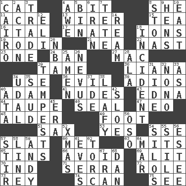 ACROSS 1. Feline 4. "This won't hurt ____!" 8. A female animal or person 11. Measure of real estate 13. One who wires 15. Afternoon social gathering 16. Slanted text style (abbr.) 17. Related on the mother's side 18. Charged atoms 19. "The Thinker" sculptor 21. Teachers' org. 22. Political cartoonist Thomas 23. Single 24. Bar 27. Big _ 29. Docile 30. Woody, climbing, usually tropical plant 34. Purpose 36. Morally bad or wrong 39. Goodbye (Sp.) 40. First of billions? 41. Unclothed pictures 43. Pulitzer Prize-winning author Ferber 44. Grayish beige 46. Lick closed 47. Modern: prefix 48. Tree or shrub in the Birch family 49. One third of a yard 51. Saxophone 53. It is so 54. Compass dir. 57. Narrow board 60. Was introduced to 63. Leaves out 65. Airtight sealed metal containers 66. Keep away from 69. Set down 70. Working for oneself (abbr.) 71. Father Junipero _ 72. Hero or heavy, e.g. 73. Marina Del _, California 74. Examine hastily 75. Observe DOWN 1. Capital of Egypt 2. 13-14th century defensive garment 3. Barter 4. Deep reverence 5. Storage container 6. SW Asia republic 7. False hair 8. Portico 9. Coop moms 10. 90 degrees 12. Connecticut Ivy Leaguer 14. 480, 500 or 516 sheets of paper 18. Happening 20. Basketball assoc. 25. So be it 26. Mole, birthmark 28. Insect wing 29. Storms 31. Helper 32. Words to Nanette 33. White ___ sheet 34. Freehold land 35. Saudi Arabian king (1953-1964) 37. Binary compound 38. Like summer trees 40. _ moment's notice (2 wds.) 42. A type of plum 45. Epoch 50. Bear (Spanish) 52. Dec. holiday 54. Grain storage towers 55. Vertical member of a panel or frame 56. First name in cosmetics 57. Disorderly outburst 58. Actor's bit 59. "60 Minutes" Commentator Rooney 61. Nights before holidays 62. Torque (variant) 64. Impair 67. Lyricist Gershwin 68. One of the 12 tribes of Israel