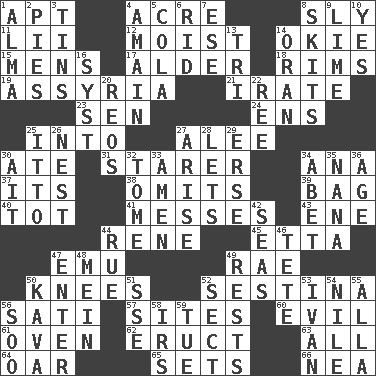 ACROSS 1. Fitting 4. Land measure 8. Wily 11. Cards in a Roman deck? 12. Wet 14. Migrant worker of the '30s 15. Not women's 17. Tree or shrub in the Birch family 18. Basketball hoops 19. Nineveh was its capital 21. Feeling or showing extreme anger 23. Elected rep. 24. Followers of ems 25. To the inside or interior of 27. Toward shelter 30. Had dinner 31. A viewer who gazes fixedly 34. Santa ___, CA 37. It is 38. Leaves out 39. Paper or plastic container 40. Small child 41. Makes clutter 43. Compass dir. 44. French philosopher Descartes 45. Singer James 47. Australian flightless bird 49. Actress Charlotte 50. Leg joints 52. French poetic form 56. Suttee (variant) 57. Locates 60. Morally bad or wrong 61. Baking chamber 62. Spew [out] 63. Everything 64. Rowing implement 65. Arranges properly for use 66. Teachers' org. DOWN 1. _ mater 2. Sliced desserts 3. Airtight sealed metal containers 4. At full speed 5. Root beer relative 6. To free from 7. Compass dir. 8. Burlesque acts 9. Citrus frut 10. Consenting reply 13. Three (prefix) 14. Northwest Algerian city 16. System (abbr.) 20. Vintage cars 22. Portuguese money of account (variant) 25. "Tell ____ the Marines!" 26. Egg locale 27. Get up 28. Allows 29. Celtic language 30. Small island 32. Heavy book 33. So be it 34. Collude with 35. Nanny 36. Personal question 42. Oceans 44. Regret 46. False hair 47. Keyboard key 48. Count _ (2 wds.) 49. Musical pauses 50. Polynesian shrub of the pepper family 51. Compass dir. 52. Religious group 53. "Terrible" tsar 54. Mediterranean tributary 55. Silent film actress Nazimova 56. "Barney Miller" actor Jack 58. Big collection agency 59. Third day of the wk.