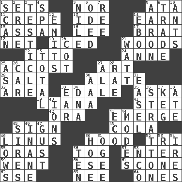 ACROSS 1. Arranges properly for use 5. And not 8. _ moment's notice (2 wds.) 11. Streamer paper 13. Binary compound 14. Merit 15. Indian state 16. Area sheltered from the wind 17. Naughty child 18. Remaining after all deductions 19. On the rocks 21. Forest 22. "Tell ____ the Marines!" 24. Singer Murray 25. Buttonhole 27. Tate display 29. Table seasoning 30. Having winglike extensions 32. Length times width 33. Peak District village in England 35. "____ silly question..." 39. Climbing, woody, usually tropical vines 41. Proofreading order 42. Mouth or opening 43. Develop 45. Public display of a written message 48. Root beer relative 49. "_ and Lucy" (Charlie Brown theme song) 50. Parka part 52. Three (prefix) 55. Mouths or openings 56. Coat; cloak 57. Keyboard key 59. Gone 60. Compass dir. 61. Biscuitlike quick bread 62. Compass dir. 63. Born 64. Singles DOWN 1. Examine hastily 2. Celtic language 3. One of the two male reproductive glands 4. Health resort 5. "Death on the ____" 6. Wrote a lyric poem 7. Portuguese money of account (variant) 8. Composer Copland 9. Barter 10. Pismires 12. Sends forth 14. Inky black, to poets 20. Small bed 21. Electrical Unit 23. "_____ Recall" 25. White ___ sheet 26. 4-wheeled motor vehicle 27. 100% 28. Actress Charlotte 30. Auto club (abbr.) 31. Artist's stand 33. Hearing organ 34. Heredity factor (abbr.) 36. Ski resort town in Vermont 37. Cask 38. Had dinner 40. Charged atoms 43. Environmental prefix 44. Methods 45. Begets 46. Silly 47. Abrupt rush of wind 49. Coldest temperatures 50. Flexible conduit 51. Double curve, resembling the letter S 53. French philosopher Descartes 54. Angers 56. Nine, plus one 58. Non-commissioned officer (abbr.)