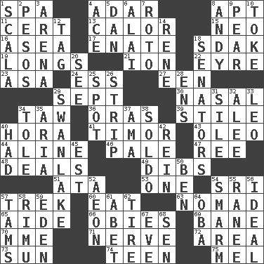 ACROSS 1. Health resort 4. The sixth month of the Jewish calendar 8. Fitting 11. An absolute certainty 13. Bodily heat indicating an inflammation 15. Modern: prefix 16. Toward the sea 17. Related on the mother's side 18. Neighbor of Neb. 19. Yearns 21. Electrically charged atom 22. Jane of fiction 23. White ___ sheet 24. Curvy letter 27. Car or cant ending 29. Back-to-school mo. 30. Rhinal 34. The 23rd letter of the Hebrew alphabet 36. Mouths or openings 39. Vertical member of a panel or frame 40. Israeli folk dance 41. The easternmost of the Lesser Sundas 43. Margarine 44. Place in a line 46. Light colored 47. To separate or throw off 48. Allots cards 49. Rights 51. _ moment's notice (2 wds.) 53. Single 54. _ Lanka 57. Long journey 60. Erode 63. Roamer 65. Assistant 66. Off-Broadway awards 69. Object of repulsion 70. Madame (abbr.) 71. Boldness 72. Type of rug 73. Player for Phoenix 74. Adolescent 75. Cartoonist voice _ Blanc DOWN 1. Any of the three canals of the cochlea 2. Mexican monetary units 3. Sports stadium 4. Adept person 5. One of the 12 tribes of Israel 6. Jai ____ 7. Printing process, for short 8. "60 Minutes" Commentator Rooney 9. Lightbulb-shaped fruit 10. Casino tip 12. Label 14. French philosopher Descartes 18. Elected representatives 20. Perceive with the eye 25. Blemish 26. Empty completely 28. Followers of ems 29. Tchaikovsky ballet 31. Filth; sediment 32. Toward shelter 33. Lion 34. Lacquered or enameled metalware 35. Operatic vocal solo 37. Housemaid (var.) 38. Twentieth part of a lira 40. Possessed 42. It's straight from the horse's mouth 45. Eastern Standard Time (abbr.) 50. Benjamin's nick name 52. A really long time 54. Excessive but superficial compliments 55. Indian princess (variant) 56. Standard of perfection 57. Scottish caps 58. Tall New Zealand timber tree 59. Genesis locale 61. Collude with 62. Become fatigued 64. Chief or king in Benin or Nigeria 67. First lady 68. Elected rep.