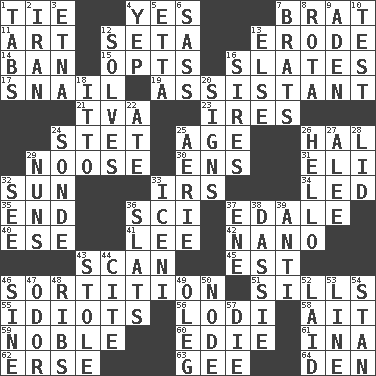 ACROSS 1. Neckwear 4. Affirmative reply 7. Naughty child 11. Nonscientific branch of learning 12. Bristle 13. Wear away 14. Bar 15. Chooses 16. Chalkboards 17. Slow-paced one 19. Aide 21. Federal power corp. 23. Angers 24. Proofreading order 25. Grow older 26. Actor Linden 29. Trap for birds or small mammals 30. Followers of ems 31. Connecticut Ivy Leaguer 32. Player for Phoenix 33. Big collection agency 34. Directed 35. Conclusion 36. _-fi 37. Peak District village in England 40. Compass dir. 41. Area sheltered from the wind 42. Billionth: prefix 43. Examine minutely or intensely 45. Eastern Standard Time (abbr.) 46. Drawing lots 51. Beverly of Met fame 55. Foolish or stupid persons 56. Farming town in central California 58. Small island 59. Impressive in appearance 60. Singer Brickell 61. _ tizzy (2 wds.) 62. Celtic language 63. Unit of force equal to gravity 64. Lair DOWN 1. Bar bills 2. SW Asia republic 3. Inactive volcano in Sicily 4. Slangy assent 5. Singer James 6. Backtalk 7. Naughty children 8. Roll call or roster of names 9. Arabian gulf 10. Trial 12. Finds the solution 13. Otherwise 16. Male parents of animals 18. "Tell ____ the Marines!" 20. Attaches a signature 22. Had dinner 24. Something which is sent 25. Nest on high 26. Phone greeting 27. Toward shelter 28. Hat (slang) 29. Religious women 32. Perceive with the eye 33. Ancient Celtic tribe of eastern Britain 36. Narrow boards 37. Compass dir. 38. Hyrax 39. Opposed to 43. Fur scarf 44. Quote 46. Trig term 47. Scent 48. Teases 49. Cassini of fashion 50. Thickened enlargement 52. Put down 53. Actor's bit 54. Comedian Laurel of Laurel & Hardy 57. Pass on