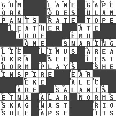 ACROSS 1. Chewing product 4. Unable to walk 8. Open wide 12. Mouth or opening 13. Lyric poems 14. ____ Bator 15. Leg coverings 18. Pace 19. Drink excessively 20. Cordwainer's material 22. Had dinner 23. Loyal 24. Australian flightless bird 25. Single 26. Catching in a trap 30. Whopper 33. "_ and Lucy" (Charlie Brown theme song) 36. Type of rug 37. Gumbo ingredient 39. Observe 40. For fear that 41. Dormintory (informal) 42. Live dramatic performances 44. A female animal or person 45. Heighten or intensify 47. Ewer handle 50. Make supply last 51. Actor Baldwin 53. "We ___ not amused" (Victoria) 54. Deli grouping 57. Inactive volcano in Sicily 59. Having or resembling wings 61. Typical models 63. Heroin 64. Political cartoonist Thomas 65. River (Sp.) 66. Not divided or shared with others 67. Domed church section 68. It is DOWN 1. Grand Old Party 2. Mountain range 3. French painter Edouard 4. Old wives' tales, e.g. 5. The sixth month of the Jewish calendar 6. Was introduced to 7. Compass dir. 8. From the throat 9. Medicinal plant 10. Infant food 11. Compass dir. 16. Edible starchy tuberous root 17. Make senseless or dizzy 21. Person who is morally reprehensible 22. Nanny (var.) 24. Followers of ems 26. Chop _ 27. Angers 28. Soft 29. Yard entry 30. Farming town in central California 31. Image 32. Blunders 34. Capri or Wight 35. Teachers' org. 38. Electrical Measurement 42. Before (prefix) 43. Lick closed 46. Mamie's mate 48. Actor Alda or Thicke 49. San ____ (Riviera town) 52. High-altitude cloud 53. Of or related to the anus 54. Backtalk 55. Johnson of "Laugh-In" 56. Stricken, poetically 57. Curvy letter 58. Ring climax 59. Santa ___, CA 60. Pet locale 62. Distress signal