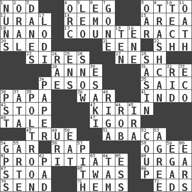 ACROSS 1. Allow head to fall sleepily 4. Cassini of fashion 8. "Beetle Bailey" pooch 12. Mountain range 14. San ____ (Riviera town) 15. Length times width 16. Billionth: prefix 17. Neutralize 20. Downhill vehicle 21. Car or cant ending 22. Quiet! 23. Founders of families 27. Soft 29. Queen of England 1702-14 31. Measure of real estate 34. Mexican monetary units 35. Ketch in the Levant 36. Dad 39. Armed conflict 41. Southeast Asian peninsula 42. Close up, plug up 43. Japanese brewing company 46. Falsehood 47. Composer Stravinsky 48. Loyal 51. Phillipine bananalike plant 54. Slender fish 56. Hit sharply and swiftly 58. Double curve, resembling the letter S 61. Appease 66. Capital and largest city of Mongolia 67. Portico 68. It was, poetically 69. Lightbulb-shaped fruit 70. Transmit 71. Folds over and sews together 72. Begley and Asner DOWN 1. Religious women 2. Taken by mouth 3. Natives or inhabitants of Denmark 4. The grampus (Milton) 5. Lion 6. Australian flightless bird 7. Went 8. Boat paddle 9. File 13 10. Technical 11. Pledge 13. Farming town in central California 18. Nine, plus one 19. Compass dir. 24. Actress Charlotte 25. Followers of ems 26. Overwhelm 28. Indian antelope 30. 1973 Nobel Price Winner (Physics) Leo 32. To free from 33. Environmental prefix 34. Some stationery 36. Pacific Standard Time (abbr.) 37. "One Day ___ Time" 38. Characterized by complete cowardliness 40. Capital of Latvia 44. Director Reiner 45. Lyricist Gershwin 49. RI univ. 50. Ingest 52. Overturn; upset 53. Match 54. Global Positioning Systems (abbr.) 55. Johnson of "Laugh-In" 57. Essential or central part 59. Mild oath 60. Hearing organs 62. Groovy apt. 63. Deep reverence 64. Scottish cap 65. Curvy letter