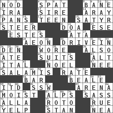 ACROSS 1. Dreamland 4. Argument over a trivial matter 8. Object of repulsion 12. Lyricist Gershwin 13. Male parent of an animal 14. Like ___ of sunshine 15. Baking dishes 17. Adolescent 18. Letch 19. Guide 21. ___ good deed 23. Compass dir. 24. _____ Park, CO 26. _ moment's notice (2 wds.) 28. A really long time 30. Popular '50s hangout 34. Lair 37. Had on 39. In addition 40. Had dinner 41. Sets or collections 43. The first octave above the treble staff 44. Slanted text style (abbr.) 46. Christmas carol 47. Born 48. Deli grouping 51. Pace 54. Drinking establishment 55. Calif. Air Force Base 58. It would 61. Compass dir. 63. Sports stadium 65. Damp 67. High mountains 71. Backtalk 72. Silent film actress Nazimova 73. Printing process, for short 74. Regret 75. Sharp bark 76. Comedian Laurel of Laurel & Hardy 77. Teachers' org. DOWN 1. Cuts off 2. Speak pompously 3. Natives or inhabitants of Denmark 4. Fast jet (abbr.) 5. Sliced dessert 6. "We ___ not amused" (Victoria) 7. Watch over 8. Sound made by sheep 9. Johnson of "Laugh-In" 10. Negative votes 11. Jane of fiction 16. Stalk of a moss capsule 18. Suttee (variant) 20. Portuguese money of account (variant) 22. Boat paddle 25. Sty mamas 27. Actress Gardner 29. Parts of speech 30. Prevent from occurring 31. Enthusiasm 32. Small island 33. Brief written record 34. Raised platform 35. Singer James 36. Be tempered by heat 38. River (Sp.) 42. Broad, flat, thick piece 45. Experiment locale 49. Vertical spar for supporting sails 50. Big collection agency 52. Afternoon social gathering 53. Hearing organs 56. Memorize 57. Follow as a consequence or result 58. "If ____ say so..." 59. Lacquered or enameled metalware 60. Deli pickle 62. Armed conflicts 64. At sea 66. Plant excrement 68. Car dealer's back yard 69. Parent Teacher Assoc. 70. Male offspring