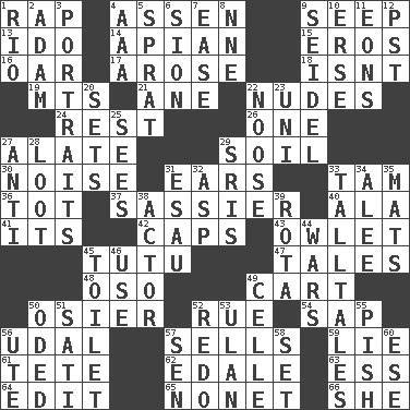 ACROSS 1. Strike 4. NE Netherlands city 9. Ooze 13. Wedding promise 14. Bee-related 15. Greek god of love 16. Rowing implement 17. Came up 18. Is not 19. Mountains (abbr.) 21. A saturated hydrocarbon 22. Unclothed pictures 24. Relief 26. Single 27. Having winglike extensions 29. The visible part of the earth's surface 30. Annoying sound 31. Hearing organs 33. Scottish cap 36. Small child 37. More impudent 40. Chicken ___ king 41. ___ a Wonderful Life 42. Smile enhancers 43. A small or young owl 45. Ballerina skirt 47. Stories 48. Bear (Spanish) 49. Heavy open wagon 50. Flexible twig of a willow tree 52. Regret 54. Plant excrement 56. Allodial 57. Makes a sale 59. Falsehood 61. False hair 62. Peak District village in England 63. Curvy letter 64. Prepare for publication 65. Music written for nine 66. A female animal or person DOWN 1. River (Sp.) 2. First of billions? 3. Likenesses of persons 4. American Automobile Association (abbr.) 5. Small fatty European fish 6. The Jewish people; Israel 7. Relaxation 8. Compass dir. 9. A glass for beer 10. Celtic language 11. Immeasurably long periods of time 12. Pacific Standard Time (abbr.) 20. Puts into a specified state 22. Trap for birds or small mammals 23. Single; one (prefix) 25. Perceives with the eye 27. Against 28. Plunder 29. Indian titles of respect 31. He sold his birthright 32. Cleo's killer 33. Baron Munchausen's specialties 34. Toward shelter 35. Floor coverings 38. Thespian 39. Roll call or roster of names 44. Armed conflicts 45. Bathroom 46. Purpose 49. Cell (Danish) 50. Wrote a lyric poem 51. Suttee (variant) 52. Do over again 53. Uhlan (variant) 55. Expression of disdain 56. Shoshoni 57. Elected rep. 58. Arrange properly for use 60. Compass dir.