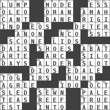 ACROSS 1. Mass 5. Method 9. Double-curved letter 12. Margarine 13. NW Algerian seaport 14. Wet nurse 15. Patter 16. Object of repulsion 17. Swiss mountan, "Queen of the Mountains" 18. Working for oneself (abbr.) 19. Greek goddess of the dawn 21. Prevent from occurring 22. At once, immediately (arch.) 24. Non-commissioned officer (abbr.) 26. Fast jet (abbr.) 27. Biscuitlike quick bread 28. Hats (slang) 29. Raised platform 30. Imelda's hoard 32. Blind as ____ 36. Johnson of "Laugh-In" 37. Curve 38. Grain storage tower 39. 24-hour periods 40. Tree or shrub in the Birch family 42. Slit 43. "Vaya con ____" 44. Peak District village in England 46. Coat; cloak 49. Big collection agency 50. Unfeeling 51. Match 53. Wedding promise 54. Sep. follower 57. Downhill vehicle 58. Stitched 61. Light colored 62. Afternoon social gatherings 63. Coral ridge 64. Loyal 65. Eastern Standard Time (abbr.) 66. To the inside or interior of 67. An important port of Yemen DOWN 1. Event scenes 2. Uhlan (variant) 3. Ananias' fault 4. Cooking vessel 5. Disorderly crowds 6. Mouth or opening 7. One of the 12 tribes of Israel 8. Compass dir. 9. Gives off 10. Gurus 11. Upper-body garment 14. "We ___ not amused" (Victoria) 19. Period of immesurable duration 20. Singles 21. Two (Sp.) 23. Olfactory organs 24. Sibling's daughter 25. Music discs 27. "Two Mules for Sister ____" 28. Titled peers of a realm 29. Male parent 31. Radiant circles of light 32. Indian state 33. Big road sign 34. _ vera 35. Small child 40. Wind 41. Tear apart 43. Pass on 45. Superhero pair 46. Clothes sense 47. Stares at amorously 48. Relatively large 52. Begley and Asner 53. A message received and understood 55. A slight indication 56. Adolescent 58. Indian title of respect (Mr.) 59. Car or cant ending 60. Soggy 61. Parent Teacher Assoc.