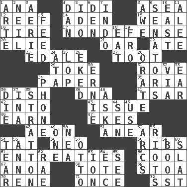 ACROSS 1. Santa ___, CA 4. "You Light Up My Life" star Conn 8. At sea 12. Coral collection 14. Arabian gulf 15. Welt 16. Become fatigued 17. Unrelated to defense, as in spending 20. Writer Wiesel 21. Boat paddle 22. Had dinner 23. Peak District village in England 27. A blast of a horn 29. Puff or smoke 31. Be footloose 34. Some stationery 35. Operatic vocal solo 36. Food container 39. Heredity factor (abbr.) 41. Russian ruler of old 42. To the inside or interior of 43. Come out of 46. Merit 47. Makes supply last 48. A really long time 51. Approach 54. Make lace 56. Modern: prefix 58. Teases 61. Pleas 66. Calm and collected 67. Small Philippine buffalo 68. Lug 69. Portico 70. French philosopher Descartes 71. Single time 72. Fast jet (abbr.) DOWN 1. Johnson of "Laugh-In" 2. Famous astronaut Armstrong 3. Nest on high 4. One of the 12 tribes of Israel 5. Wedding promise 6. Lair 7. Southeast Asian peninsula 8. Deep reverence 9. Elected representatives 10. 90 degrees 11. Toward shelter 13. Nourish 18. Consume 19. Back 24. _ moment's notice (2 wds.) 25. Trim (branches) 26. Made supply last 28. Declaim 30. Bert's buddy 32. By way of 33. Hearing organ 34. Give a jingle 36. Pass on 37. _ tizzy (2 wds.) 38. Ski resort town in Vermont 40. "____ silly question..." 44. Elected rep. 45. Purpose 49. Single 50. Teachers' org. 52. Arches 53. Disturbances 54. Lacerate 55. Queen of England 1702-14 57. "Beetle Bailey" pooch 59. Scornful sounds 60. Narrow board 62. Actress Charlotte 63. Electrically charged atom 64. And so on (abbr.) 65. Perceive with the eye