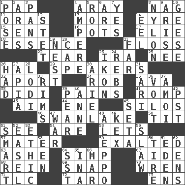 ACROSS 1. Infant food 4. Like ___ of sunshine 8. Tired old horse 11. Mouths or openings 13. Greater amount 14. Jane of fiction 15. Emitted 16. Plant holders 17. Writer Wiesel 18. Center 21. Soft thread for cleaning between teeth 22. Pull apart 23. Lyricist Gershwin 25. Born 26. Actor Linden 29. Orators 32. To the left, to Queeg 34. Director Reiner 35. Actress Gardner 38. "You Light Up My Life" star Conn 39. Aches 41. Play 43. Direct toward a target or goal 44. Compass dir. 45. Grain storage towers 46. Tchaikovsky ballet 50. Teat (slang) 51. Observe 54. "We ___ not amused" (Victoria) 55. Allows 57. Mother 59. Honored 63. American tennis player Robert 64. Simple or foolish person 67. Helper 68. It's straight from the horse's mouth 69. Fastener 70. Songbird 71. Affectionate concern, for short 72. Edible starchy tuberous root 73. Followers of ems DOWN 1. Introduce or present, as a question 2. Ancient Greek god of war 3. Zero-star reviews 4. Electrical Unit 5. Friend of Pooh 6. Tate display 7. Affirmative reply 8. High-strength synthetic material 9. Originate 10. Honkers 12. Proofreading order 14. Snakelike fish 19. A home for chicks 20. Head covering 21. Distant 23. Visual representation of an object 24. Confederate soldiers (slang) 26. Possessed 27. Capital of Western Samoa 28. Farming town in central California 30. Satellite of Uranus 31. Indian skirt 33. Basketball hoops 36. Electrical Unit 37. Mine, in Marseilles 39. Lightbulb-shaped fruit 40. Queen of England 1702-14 42. Pacific Standard Time (abbr.) 45. Bristle 47. Armed conflict 48. City in Syria 49. Dry husk or covering 51. Don Adams' spy role 52. Artist's stand 53. Moral principle 56. Cole _ (cabbage dish) 58. Car or cant ending 60. Become fatigued 61. Paradise 62. Cub Scout units 64. Fast jet (abbr.) 65. _ tizzy (2 wds.) 66. Spoil