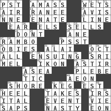 ACROSS 1. Pacific Standard Time (abbr.) 4. Collect or gather 9. Soaks 13. Atmosphere 14. The wife of a rajah (variant) 15. Deliberation 16. Compass dir. 17. Related on the mother's side 18. Actor's bit 19. Ewer handle 21. Raised railways 22. Exchanges for money 24. Do not 26. One (Scot) 27. Role for Stallone 29. Inconspicuous attention getter 30. Off-Broadway awards 31. Jai ____ 33. Sep. follower 36. Everything 37. Taking place subsequently 40. _ Lanka 41. Cartoonist voice _ Blanc 42. Image 43. Moving about 45. Toward the sea 47. First-year military academy student 48. Nervous spasm 49. Period of immesurable duration 50. Dinah or Pauly 52. Cask 54. Eastern Standard Time (abbr.) 56. Person who is morally reprehensible 57. Receives possession of 59. Big collection agency 61. Slanted text style (abbr.) 62. Incident 63. Compete 64. Plant excrements 65. Thoroughly unpleasant 66. A really long time DOWN 1. Baking dish 2. Trig term 3. Excercise machine 4. "We ___ not amused" (Victoria) 5. French painter Edouard 6. Of or related to the anus 7. Puts into a specified state 8. Observe 9. Place for singles 10. Morally bad or wrong 11. Airtight sealed metal containers 12. Compass dir. 20. Loose flowing garment 22. Indian antelope 23. Followers of ems 25. Olfactory organ 27. Wander 28. Competent 29. Ache 31. "____ silly question..." 32. Nilotic language 33. Clearly or manifestly demonstrative 34. Baby bed with high sides 35. Become fatigued 38. Sibling's daughter 39. Yawn 44. A type of plum 45. Ringlike coral islands and reefs 46. Title for a knight 49. Rep 50. Stalk of a moss capsule 51. Pile 52. Polynesian shrub of the pepper family 53. Makes supply last 55. Musical group of three 56. Part of HMS, perhaps 57. Nine, plus one 58. Filthy place 60. Elected rep.