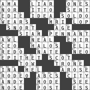 ACROSS 1. Nanny (var.) 4. One who doesn't tell the truth 8. Singles 12. And not 13. "Tell ____ the Marines!" 14. Emitted 15. Singer Brickell 17. The content of cognition 18. Twentieth part of a lira 19. Puts on (as clothing) 21. Medical imaging device (abbr.) 23. Trim (branches) 24. Derisive sound 26. Grow older 28. Thailand, formerly 30. Pre-World Series prize 34. Leather borer 37. Be tempered by heat 39. Arab leader 40. Corporate head (abbr.) 41. Rings 43. Connecticut Ivy Leaguer 44. Make new 46. Nathan's nickname 47. Modern: prefix 48. Curse 51. Native of Scotland 54. Pull behind 55. Heavy duty weighing machine 58. _ tizzy (2 wds.) 61. Cartoonist voice _ Blanc 63. Came up 65. Cowboy competition 67. Lettered men learn these first 71. Municipality 72. "60 Minutes" Commentator Rooney 73. Method 74. Observe 75. Characteristic smell of wine 76. Mail 77. Curvy letter DOWN 1. Afresh 2. Methods 3. Believer in; advocate of (suffix) 4. Cards in a Roman deck? 5. It would 6. Had dinner 7. Wander 8. Bear (Spanish) 9. 1994 drama film starring Jodie Foster 10. Inside; within (prefix) 11. Discontinue 16. Greek god of love 18. Public display of a written message 20. Indian title of respect (Mr.) 22. Actress Charlotte 25. Hyperbolic tangent 27. Compass dir. 29. Intended 30. Graphs 31. So be it 32. The longest river in the world 33. Musical group of three 34. 43,560 square feet 35. Shed a tear 36. Farming town in central California 38. Wing 42. Religious group 45. Baseball player Mel 49. Like (prefix) 50. She-sheep 52. Mouth or opening 53. Torque (variant) 56. Annoying sound 57. _____ Park, CO 58. SW Asia republic 59. Words to Nanette 60. Sums up 62. Desk light 64. Sight organs 66. Sight organ 68. Oct. 31 cry 69. Music discs 70. Put into a specified state