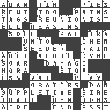 ACROSS 1. First man 5. Metal container 8. Sliced desserts 12. Monthly bill 13. Wedding promise 14. Aches 15. Labels 16. One who advocates reunion 19. Pipe bend 20. Thinks logically 21. Flatfish 23. Actress Charlotte 24. Retirement account (abbr.) 27. To (old English) 30. Sign of something about to happen 31. Sowing specialist 34. Precipitation 35. Collude with 38. Nest on high 40. Centimeter-gram-second unit of force 41. Fly high 42. Break 44. Israeli folk dance 45. Portico 46. Double-curved letter 47. Large container 50. Shaw product 53. Speakers 57. One of the 12 tribes of Israel 59. Supplementary 63. Male parent of an animal 64. Distinguishing feature 65. Lair 66. Charged particles 67. Assistant 68. Conclude 69. Inconspicuous attention getter DOWN 1. Johnson of "Laugh-In" 2. Allots cards 3. White American of non-Hispanic descent 4. Mountains (abbr.) 5. Become fatigued 6. It may be bright or harebrained 7. Common sense 8. Baking dish 9. One more than two 10. Followers of ems 11. Fast jet (abbr.) 14. Airs 17. And not 18. _ tizzy (2 wds.) 20. French philosopher Descartes 22. A period of five years 24. "If ____ say so..." 25. It's straight from the horse's mouth 26. Queen of England 1702-14 28. Afternoon social gathering 29. Wrote a lyric poem 30. Severe or trying experience 32. Epoch 33. Basketball hoops 35. American tennis player Robert 36. Scornful sounds 37. Hearing organs 39. Consume 43. Republicans 47. Electrical Unit 48. "We ___ not amused" (Victoria) 49. Make lace 51. Goodbye (Sp.) 52. Tall tales 54. Event that recurs at intervals 55. Baking chamber 56. Tear apart 58. A home for chicks 59. R.R. building 60. RI univ. 61. Groovy apt. 62. Sliced dessert 63. Small drink