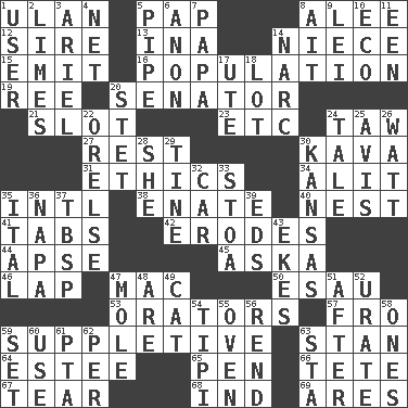 ACROSS 1. Uhlan (variant) 5. Infant food 8. Toward shelter 12. Beget 13. _ tizzy (2 wds.) 14. Sibling's daughter 15. Send forth 16. Census information 19. To sift 20. Legislator 21. Slit 23. And so on (abbr.) 24. The 23rd letter of the Hebrew alphabet 27. Remainder 30. Polynesian shrub of the pepper family 31. Principles of right and wrong 34. Came down and settled, as after flight 35. International (abbr.) 38. Related on the mother's side 40. A home for chicks 41. Bar bills 42. Eats (away) 44. Domed church section 45. "____ silly question..." 46. Infant locale 47. Big _ 50. He sold his birthright 53. Speakers 57. Back 59. Supplying deficiencies 63. Comedian Laurel of Laurel & Hardy 64. First name in cosmetics 65. Writing instrument 66. Wig 67. Rend 68. Working for oneself (abbr.) 69. Ancient Greek god of war DOWN 1. One who makes use of a thing 2. Citrus fruits 3. Satellite of Uranus 4. Fish or hair follower 5. Corncob 6. At once, immediately (arch.) 7. Dad 8. Small island 9. Flowery wreath 10. Environmental prefix 11. Car or cant ending 14. Drug cop 17. Shoshoni 18. Car dealer's back yard 20. Proofreading order 22. Threatening words 24. Lie 25. Advice 26. Electrical Unit 28. A female animal or person 29. Prong on a fork 30. Sunflower state 32. Auto 33. Portico 35. Slanted text style (abbr.) 36. California wine valley 37. Cook's measure (abbr.) 39. Begley and Asner 43. Makes supply last 47. Undercover agent 48. "We ___ not amused" (Victoria) 49. Feline 51. Following 52. A salt of uric acid 54. Native american tent (variation) 55. Baking chamber 56. Tear apart 58. Singles 59. Arrange properly for use 60. Purpose 61. Parent Teacher Assoc. 62. For each 63. R.R. building