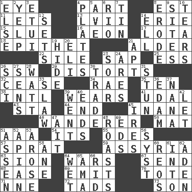 ACROSS 1. Sight organ 4. Piece 8. Eastern Standard Time (abbr.) 11. Allows 13. 57 in ancient Rome 14. One of the Great Lakes 15. Change direction abruptly 16. Period of immesurable duration 17. Globular water bottle used in Asia 18. Curse 21. Tree or shrub in the Birch family 22. Drop; flow; fall 23. Plant excrement 25. Curvy letter 26. Compass dir. 29. What propaganda does 32. Stop 34. Actress Charlotte 35. "___ Little Indians" 38. International (abbr.) 39. Puts on (as clothing) 41. Hereditary estate 43. R.R. building 44. Conclusion 45. Lacking in sense or substance 46. Roamer 50. Floor protector 51. American Automobile Association (abbr.) 54. ___ a Wonderful Life 55. Lyric poems 57. Small fatty European fish 59. Nineveh was its capital 63. The Jewish people; Israel 64. Armed conflicts 67. Transmit 68. Comfort 69. Give off 70. Lug 71. Compass dir. 72. Bits 73. Manchild DOWN 1. Otherwise 2. Sharp bark 3. Needle case 4. Food holders 5. "___ Maria" 6. _ de Janeiro 7. Shallow baking pan 8. Eat (away) 9. Settings 10. Pulls into pieces 12. Arranges properly for use 14. Pipe bend 19. Flintstone garb 20. Connecticut Ivy Leaguer 21. Fitting 23. Fly high 24. Ancient Greek god of war 26. _-fi 27. Elected reps. 28. Electrical Unit 30. Exchange 31. Astound 33. Cole _ (cabbage dish) 36. Dutch treat 37. Grandmother 39. Gone 40. Conclusions 42. Allow 45. Angers 47. Small island 48. Ridicules or criticizes harshly 49. Begley and Asner 51. NE Netherlands city 52. Bee-related 53. Came up 56. System (abbr.) 58. One (Scot) 60. Vintage cars 61. To the inside or interior of 62. Arabian gulf 64. Soggy 65. Nanny (var.) 66. To free from