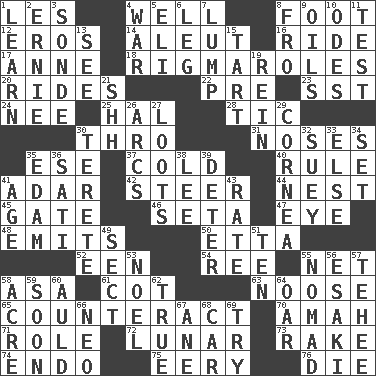 ACROSS 1. French article 4. Not ill 8. Pick up the tab 12. Greek god of love 14. Native American of Southwest Alaska 16. Travel on an animal 17. Queen of England 1702-14 18. Frustrating wastes of time 20. Amusement-park features 22. Before (prefix) 23. Fast jet (abbr.) 24. Born 25. Actor Linden 28. Nervous spasm 30. Through, poetically 31. Olfactory organs 35. Compass dir. 37. Lacking warmth 40. Court order 41. The sixth month of the Jewish calendar 42. Guide 44. Egg locale 45. Yard entry 46. Bristle 47. Sight organ 48. Gives off 50. Singer James 52. Car or cant ending 54. Portuguese money of account (variant) 55. Remaining after all deductions 58. White ___ sheet 61. Small bed 63. Trap for birds or small mammals 65. Neutralize 70. Housemaid 71. Hero or heavy, e.g. 72. Type of eclipse 73. Libertine 74. Inside; within (prefix) 75. Suggestive of the supernatural 76. Expire DOWN 1. Memorize 2. Bert's buddy 3. Something which is sent 4. Armed conflict 5. Connecticut Ivy Leaguer 6. Part of a journey 7. Mass 8. Back 9. Lubricates 10. Lyric poems 11. Trial 13. Observe 15. Small pie 19. It's straight from the horse's mouth 21. Quiet! 26. Curves 27. Plunders 29. Pupil covering 30. Cylindrical with tapered ends 32. Chop _ 33. Otherwise 34. Put into a specified state 35. Dutch treat 36. Suttee (variant) 38. Area sheltered from the wind 39. Prevent from occurring 41. Ripen 43. Pace 49. Religious group 51. Nine, plus one 53. Christmas carol 55. Wanderer 56. 1973 Nobel Price Winner (Physics) Leo 57. Giggle 58. 43,560 square feet 59. Within a short period 60. Old (Scot.) 62. Loyal 64. Boat paddle 66. Modern: prefix 67. A saturated hydrocarbon 68. 4-wheeled motor vehicle 69. Attempt to accomplish something