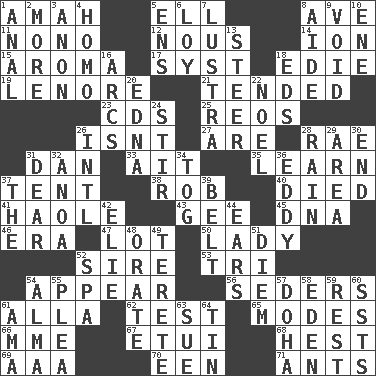 ACROSS 1. Nanny 5. Pipe bend 8. "___ Maria" 11. Words to Nanette 12. Good sense 14. Electrically charged atom 15. Scent 17. System (abbr.) 18. Singer Brickell 19. Poe poem 21. Watched over 23. Music discs 25. Vintage cars 26. Is not 27. "We ___ not amused" (Victoria) 28. Actress Charlotte 31. Daniel's nick name 33. Small island 35. Memorize 37. Portable shelter 38. Director Reiner 40. Passed on 41. White Person, in Hawaii 43. Unit of force equal to gravity 45. Heredity factor (abbr.) 46. Epoch 47. Car dealer's back yard 50. Kenny Rogers chart-topper in '80 52. Father 53. Three (prefix) 54. Seem 56. Spring feasts 61. Silent film actress Nazimova 62. Trial 65. Methods 66. Madame (abbr.) 67. Needle case 68. Command 69. American Automobile Association (abbr.) 70. Car or cant ending 71. Pismires DOWN 1. Of or related to the anus 2. Greater amount 3. At once, immediately (arch.) 4. Like (prefix) 5. Followers of ems 6. Myrna of the movies 7. A period of five years 8. Assistant 9. Empty area or space 10. Compass dir. 13. Navigate 16. Curves 18. Begley and Asner 20. Pulitzer Prize-winning author Ferber 22. Christmas carol 24. Agitate 26. International (abbr.) 28. Precipitation 29. Length times width 30. Conclude 31. Letter starter 32. Small Philippine buffalo 34. Coat; cloak 36. Whirlpool 37. Definite Article 39. Waist strap 42. Writer Wiesel 44. Hearing organs 48. Declaim 49. Cylindrical with tapered ends 51. South Vietnam president (1954) 52. Health resort 54. _ mater 55. Entreaty 57. Capital of the state of Qatar 58. Genesis locale 59. Relief 60. Fast planes 61. Nursemaid (var.) 63. Institute legal proceedings 64. Shallow baking pan