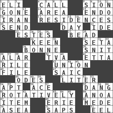ACROSS 1. Biblical high priest 4. Give a ring to 8. The Jewish people; Israel 12. Went 14. Type of rug 15. Inside; within (prefix) 16. SW Asia republic 17. Homes 20. Post 21. 24 hours 22. Binary compound 23. _____ Park, CO 27. Necklace unit 29. Peachy ____! 31. Stalk of a moss capsule 34. Child's nurse 35. In a ____ (agitated or irritated) 36. Having or resembling wings 39. Federal power corp. 41. Singer James 42. Cause heat under the collar 43. The state of being joined or united 46. Do some clerical work 47. Ketch in the Levant 48. Lyric poems 51. 61 cubic inches 54. Fitting 56. Adept person 58. Mild oath, euphamism for damn 61. Rotating or pertaining to rotation 66. Small Philippine buffalo 67. A distinct part 68. One of the Great Lakes 69. Ancient Persian 70. At sea 71. Plant excrements 72. Snakelike fish DOWN 1. The front part of a cuirass 2. Old wives' tales, e.g. 3. Lacking in sense or substance 4. Auto 5. "We ___ not amused" (Victoria) 6. French article 7. Put down 8. Elected rep. 9. Happening 10. Wrote a lyric poem 11. Characteristic smell of wine 13. Extremities 18. Apply (a substance) by light strokes 19. Sight organ 24. Ring climax 25. Car or cant ending 26. Emitted 28. NE Netherlands city 30. Congenital growth or mark on the skin 32. Teat (slang) 33. _ moment's notice (2 wds.) 34. A special lineage 36. Sandy's bark 37. Cards in a Roman deck? 38. One to whom something is allotted 40. Of or related to the anus 44. One more than two 45. Sep. follower 49. Consume 50. _-fi 52. Dutch treat 53. The wife of a rajah (variant) 54. Operatic vocal solo 55. Plant holders 57. Nights before holidays 59. Connecting point 60. Highlander 62. Nanny (var.) 63. Period 64. Mouth edge 65. Affirmative reply