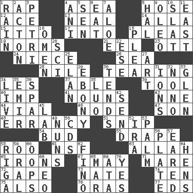 ACROSS 1. Hit sharply and swiftly 4. At sea 8. Flexible conduit 12. Adept person 13. Be tempered by heat 14. Silent film actress Nazimova 15. "Tell ____ the Marines!" 17. To the inside or interior of 18. Entreaties 19. Typical standards 21. Snakelike fish 23. Baseball player Mel 24. Sibling's daughter 26. Ocean 28. The longest river in the world 30. Pulling apart 34. French article 37. Competent 39. Utensil 40. Mischievous child 41. Parts of speech 43. Compass dir. 44. Small bottle 46. Connecting point 47. Male offspring 48. The state or an instance of erring 51. Clip 54. Partially opened flower 55. Window treatment 58. Friend of Pooh 61. Science/research agcy. 63. Assad's deity 65. Removes the wrinkles 67. "If ____ say so..." 71. Female horse 72. Open wide 73. Nathan's nickname 74. "___ Little Indians" 75. In addition 76. Mouths or openings 77. Begley and Asner DOWN 1. Water falling in drops from the sky 2. 13-14th century defensive garment 3. _ dish (used to culture cells) 4. Black tropical American cuckoo 5. Elected rep. 6. Consume 7. _ vera 8. Actor Linden 9. Butter sub 10. Narrow board 11. Compass direction 16. Sign of things to come 18. Entreaty 20. _-fi 22. Compass dir. 25. Enthusiasm 27. Tate display 29. Black 30. Watches over 31. Charged atoms 32. Words to Nanette 33. Small, secluded valley 34. Not recorded 35. Independent ruler or chieftain 36. Practice fight 38. Nilotic language 42. Post 45. Experiment locale 49. Religious women 50. Music discs 52. Lyricist Gershwin 53. Inside of hand 56. Food holder 57. Having ears or earlike features 58. Capital of Latvia 59. Spoken 60. I made a mistake 62. A pale, very dry sherry 64. Coop moms 66. Modern: prefix 68. Third mo. 69. _ moment's notice (2 wds.) 70. Affirmative reply