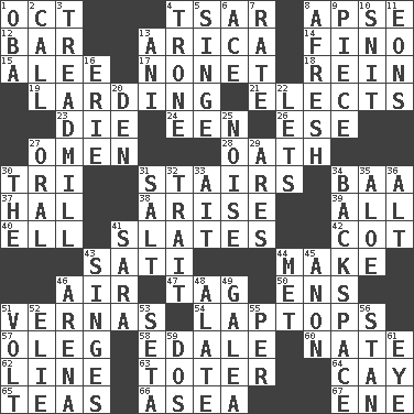 ACROSS 1. Sep. follower 4. Russian ruler of old 8. Domed church section 12. Drinking establishment 13. N. Chile seaport 14. Fine (Spanish) 15. Toward shelter 17. Music written for nine 18. It's straight from the horse's mouth 19. Preparing or cooking with lard 21. Opts 23. Expire 24. Car or cant ending 26. Compass dir. 27. Sign of something about to happen 28. Pledge 30. Three (prefix) 31. Flight of steps 34. Sound made by sheep 37. Actor Linden 38. Originate 39. Everything 40. Pipe bend 41. Chalkboards 42. Small bed 43. Suttee (variant) 44. Create 46. Atmosphere 47. Label 50. Followers of ems 51. Actresses Bloom and Felton 54. Portable computers 57. Cassini of fashion 58. Peak District village in England 60. Nathan's nickname 62. Actor's bit 63. Carrier 64. Island 65. Afternoon social gatherings 66. At sea 67. Compass dir. DOWN 1. Chief or king in Benin or Nigeria 2. Give a ring to 3. Excercise machine 4. Marketplace scale 5. Scorch 6. Adept person 7. Pace 8. Anew 9. Part 10. In a ____ (agitated or irritated) 11. Immeasurably long periods of time 13. Cuckoo 16. 4th largest of the Great Lakes 20. Lair 22. Allows 25. Annoying sound 27. Relating to the mouth 29. Ancient Greek god of war 30. Definite Article 31. Table seasoning 32. Distinguishing feature 33. Small island 34. Keyboard key 35. Medicinal plant 36. Keyboard modifier key 41. "Two Mules for Sister ____" 43. Burns superficially 44. Was introduced to 45. Soon (poet.) 46. Sports stadium 48. Having winglike extensions 49. An organ shaped like a helmet 51. Electrical Unit 52. Writer Wiesel 53. Bristle 55. For each 56. Comedian Laurel of Laurel & Hardy 59. Two (Sp.) 61. Sight organ